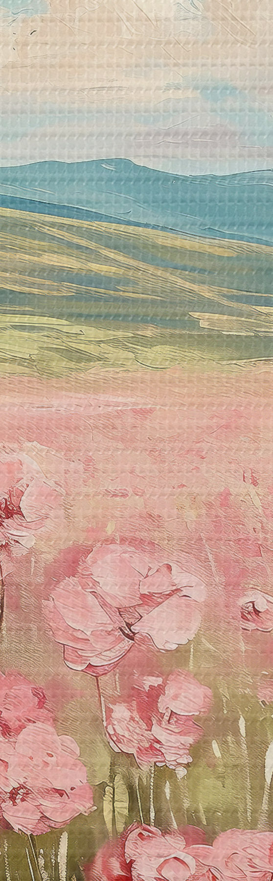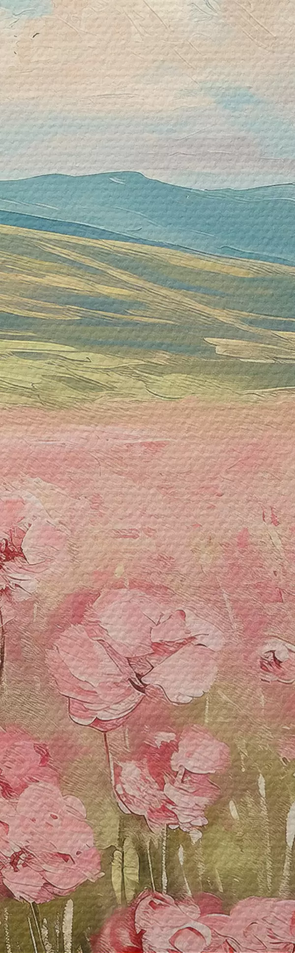 Schilderijen Weide met roze bloemen, bergen, natuurlandschap, blauwe lucht met wolken, acryl  s40232