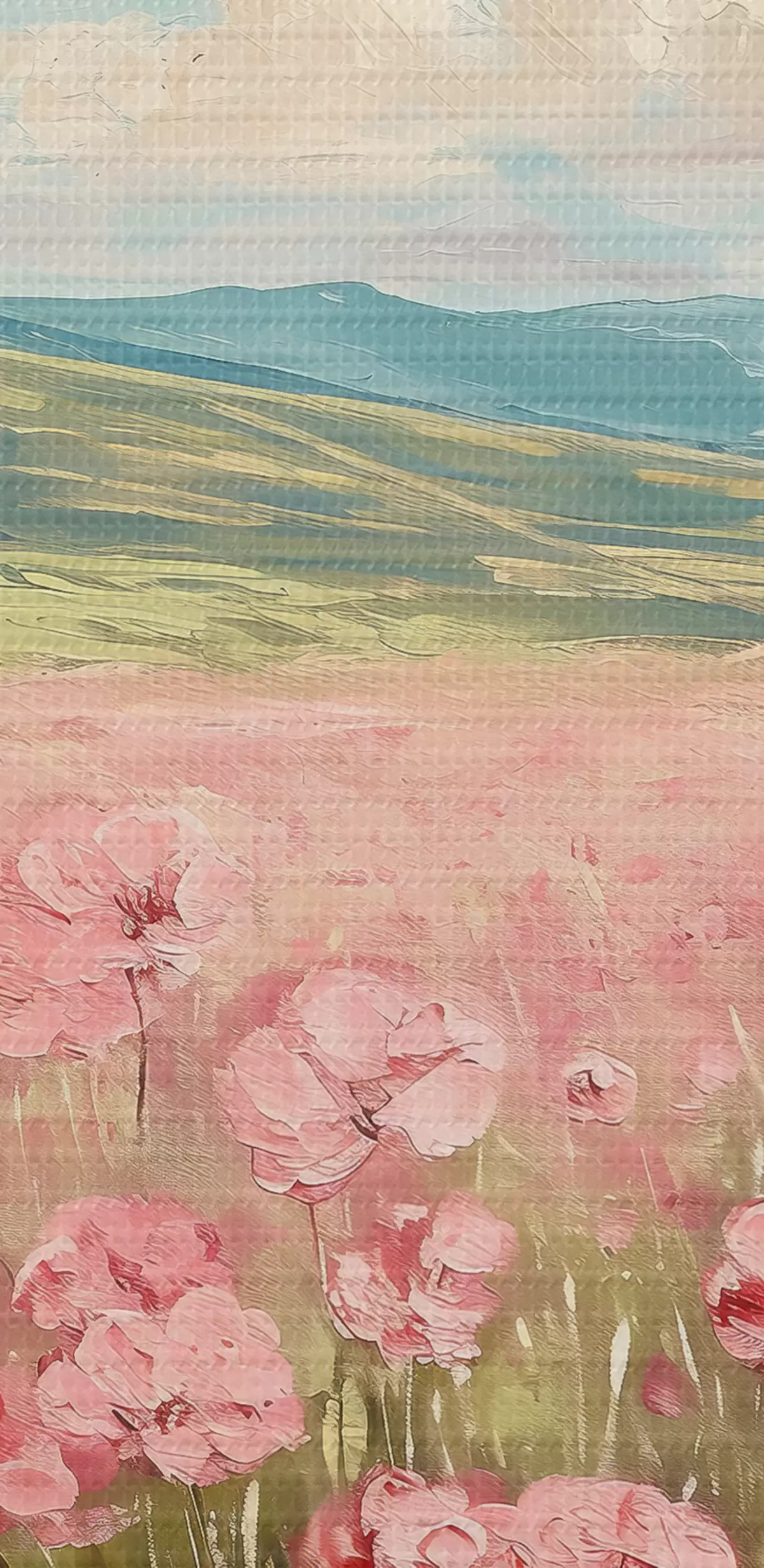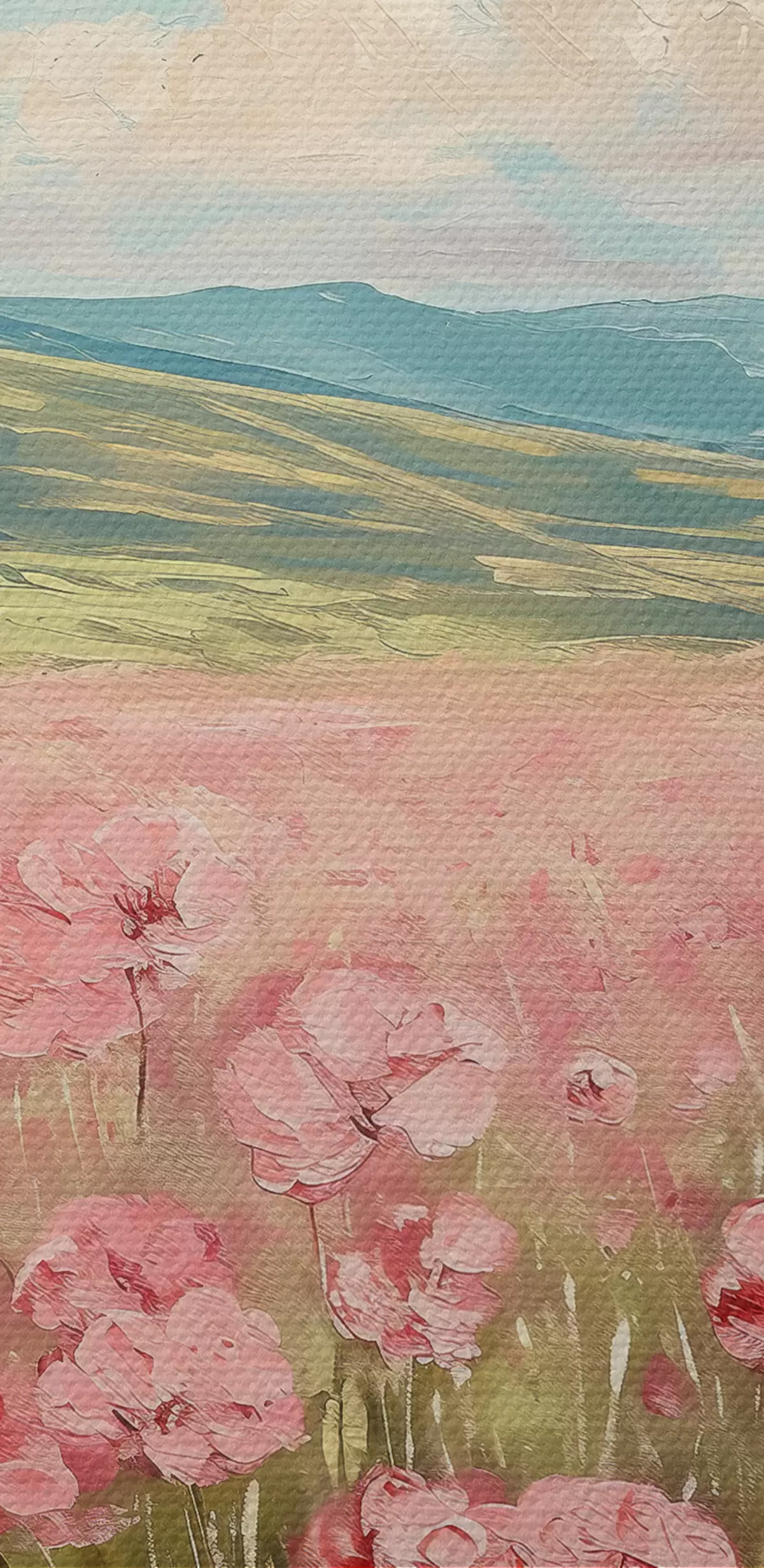 Schilderijen Weide met roze bloemen, bergen, natuurlandschap, blauwe lucht met wolken, acryl  s40232