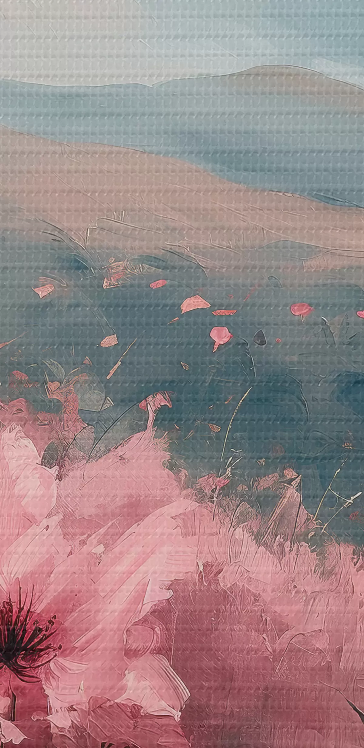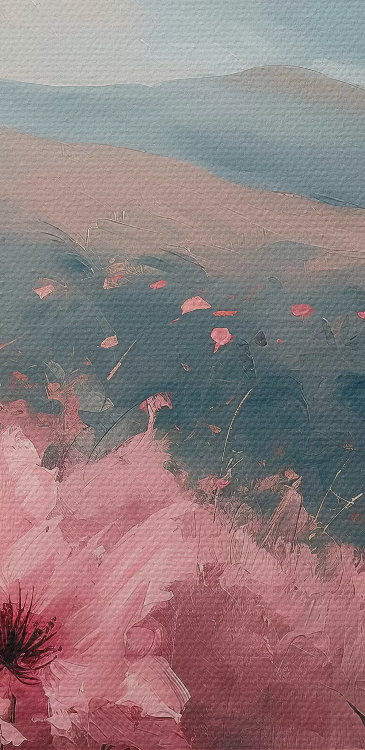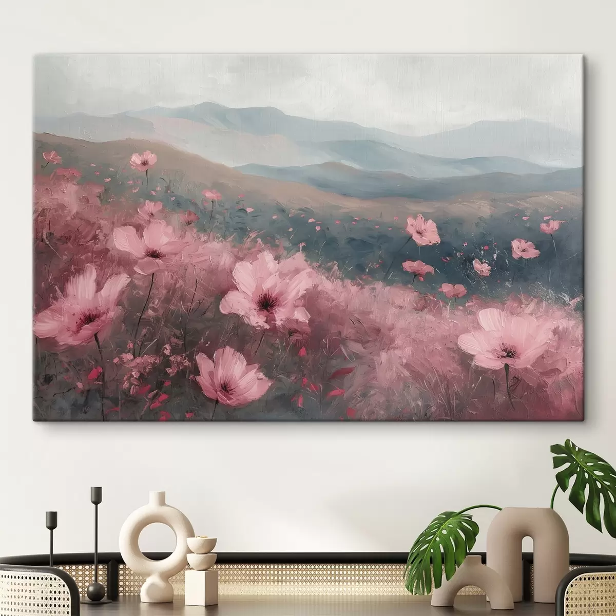 Schilderijen Roze bloemen in de weide, natuurlandschap, bergen, olieverfschilderij, levendige penseelstreken s40233