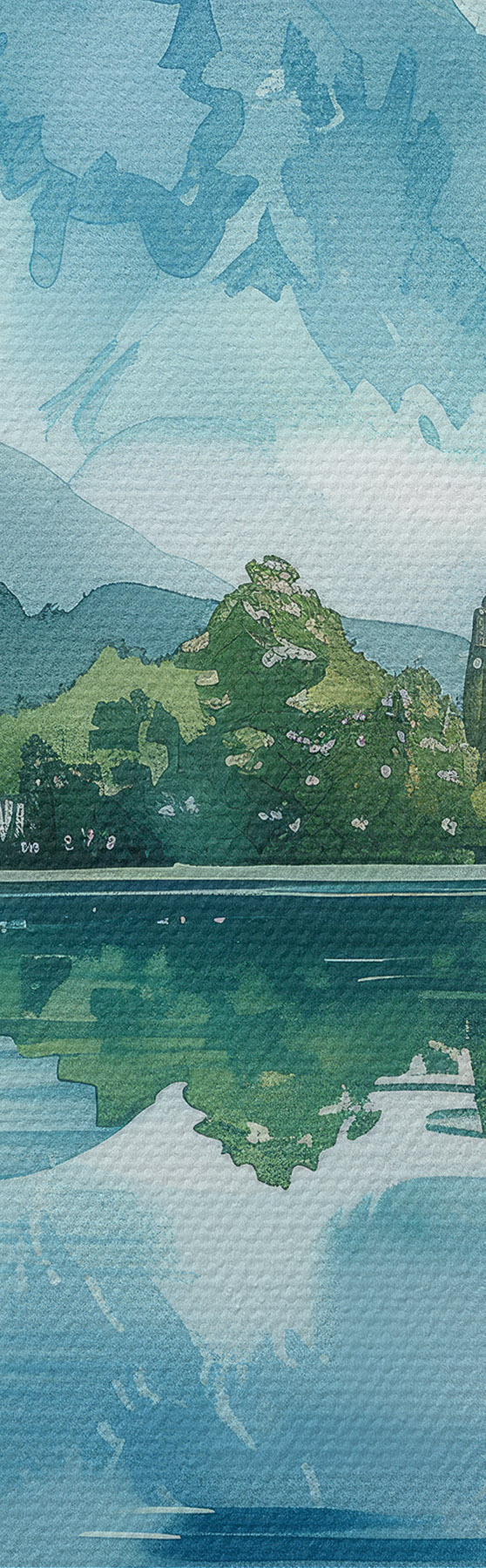 Schilderijen Aquarel bergen landschap, rivier, groene en blauwe kleuren s40310