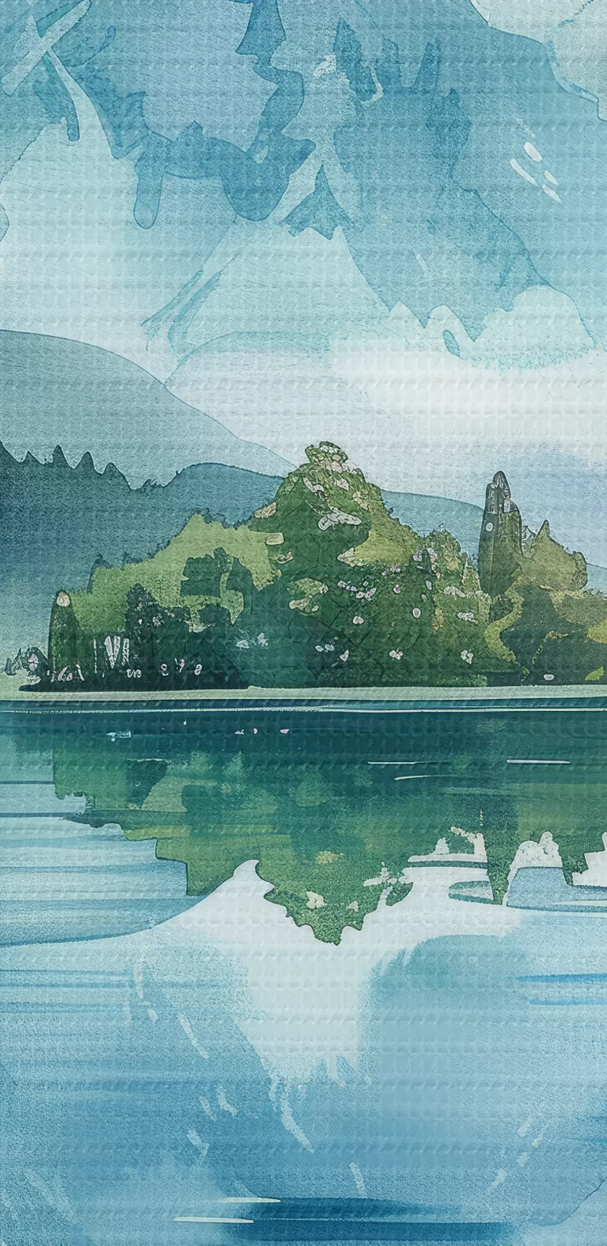 Schilderij Aquarel bergen landschap, rivier, groene en blauwe kleuren Art. s40310