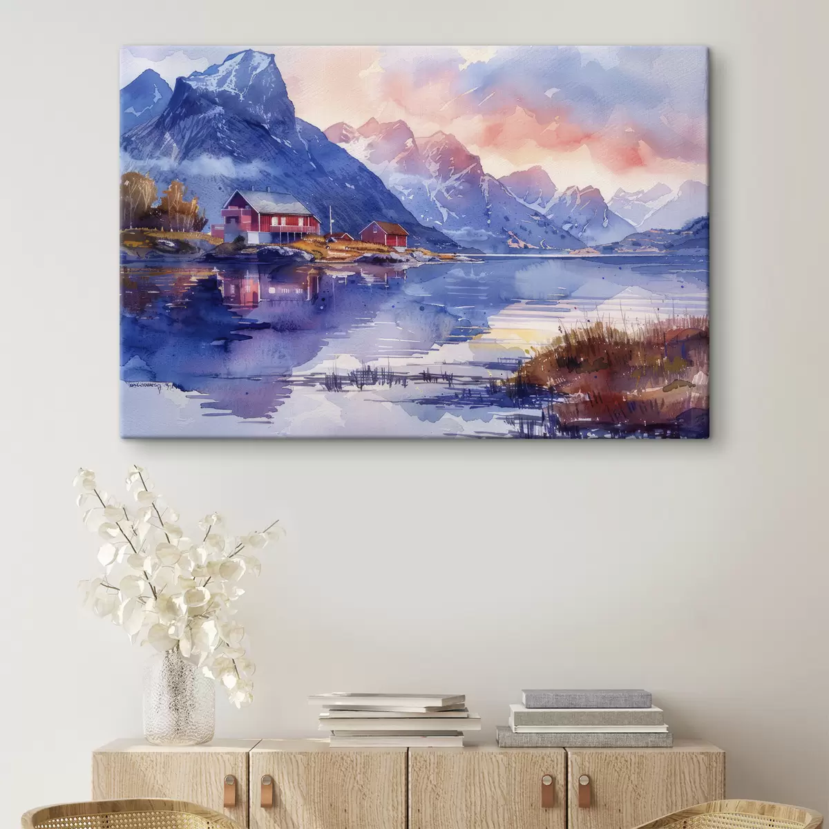 Schilderijen Noorwegen dorp, zonsondergang lucht, kalme rivier, bergen, aquarel s40311