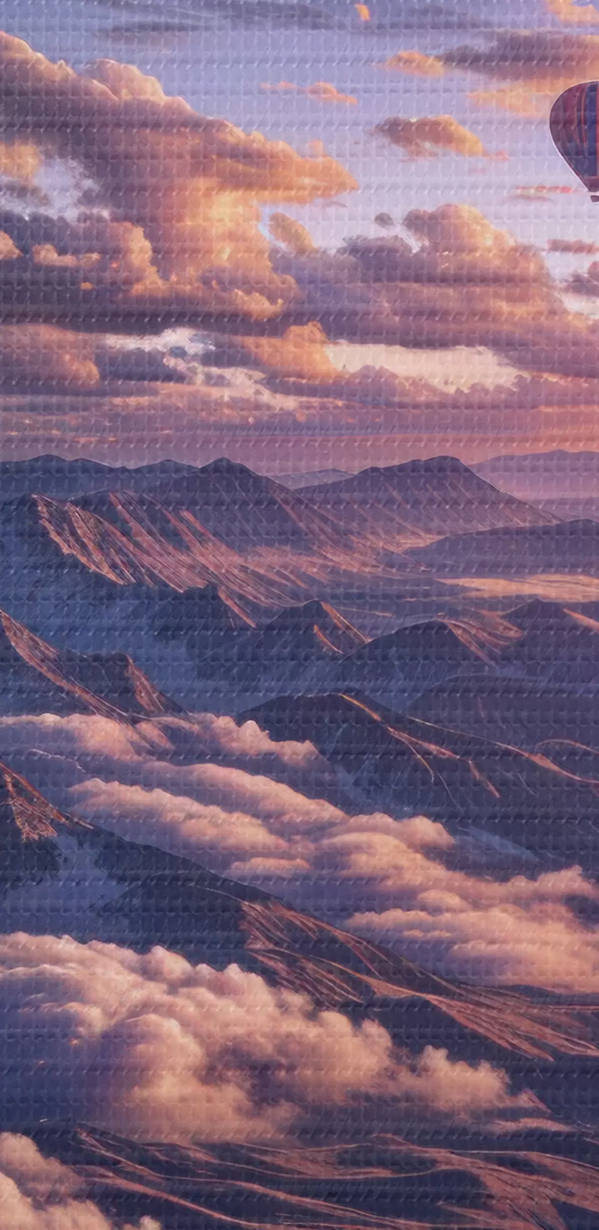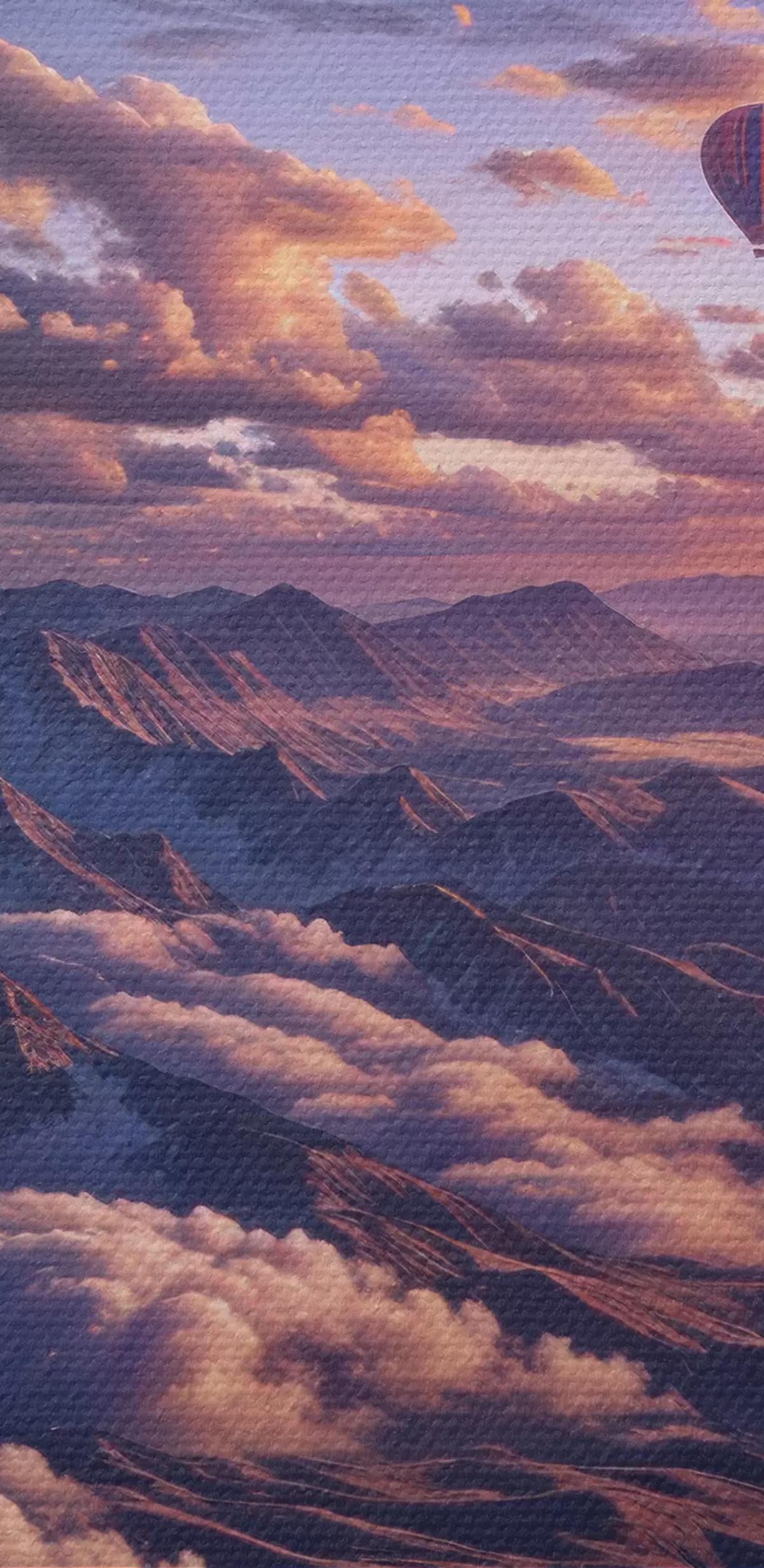 Schilderij Heteluchtballonnen zweven over een bergachtig landschap bij zonsondergang, met wolken en levendige kleuren in de lucht Art. s40397