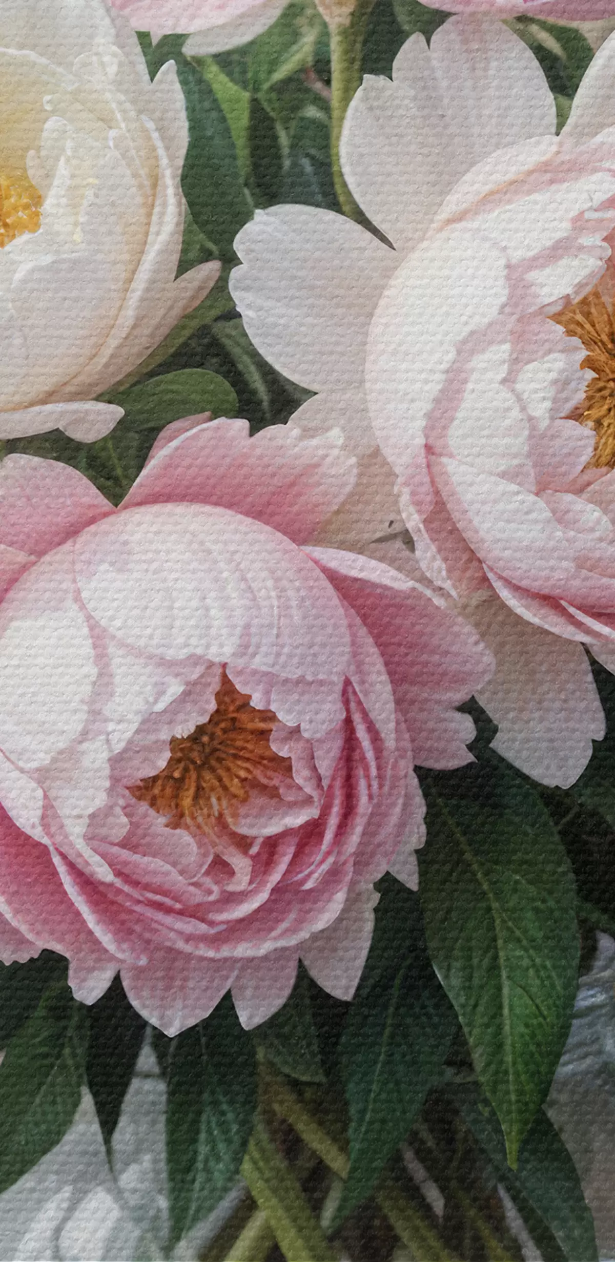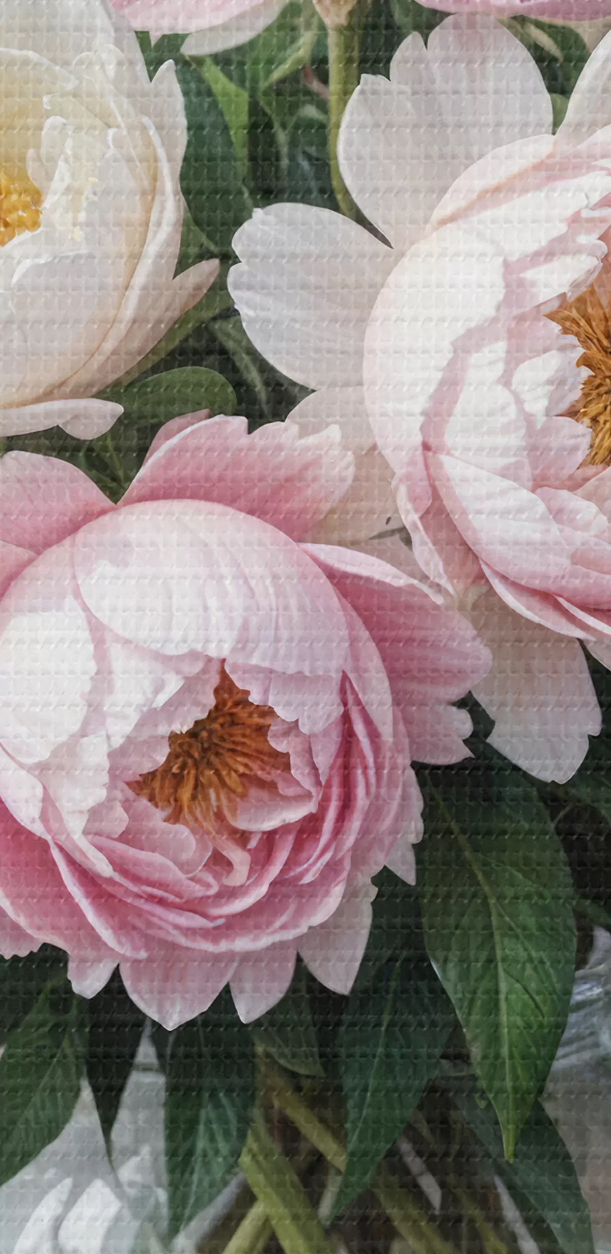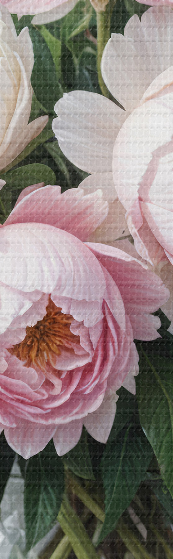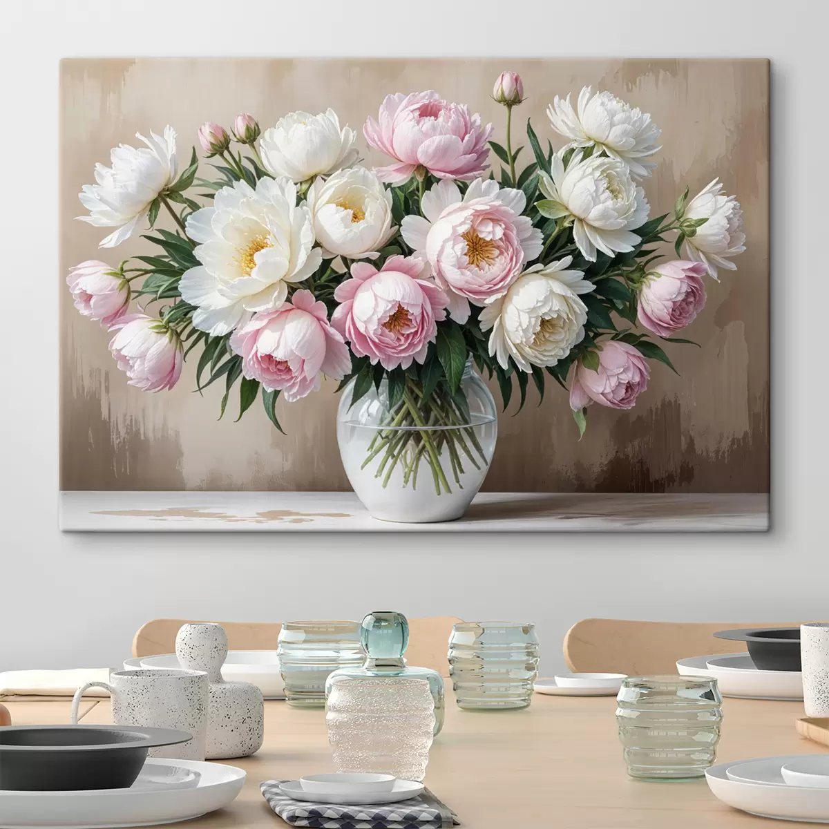 Schilderij Een boeket van prachtige roze en witte pioenrozen in een glazen vaas, gerangschikt op een houten oppervlak Art. s40398