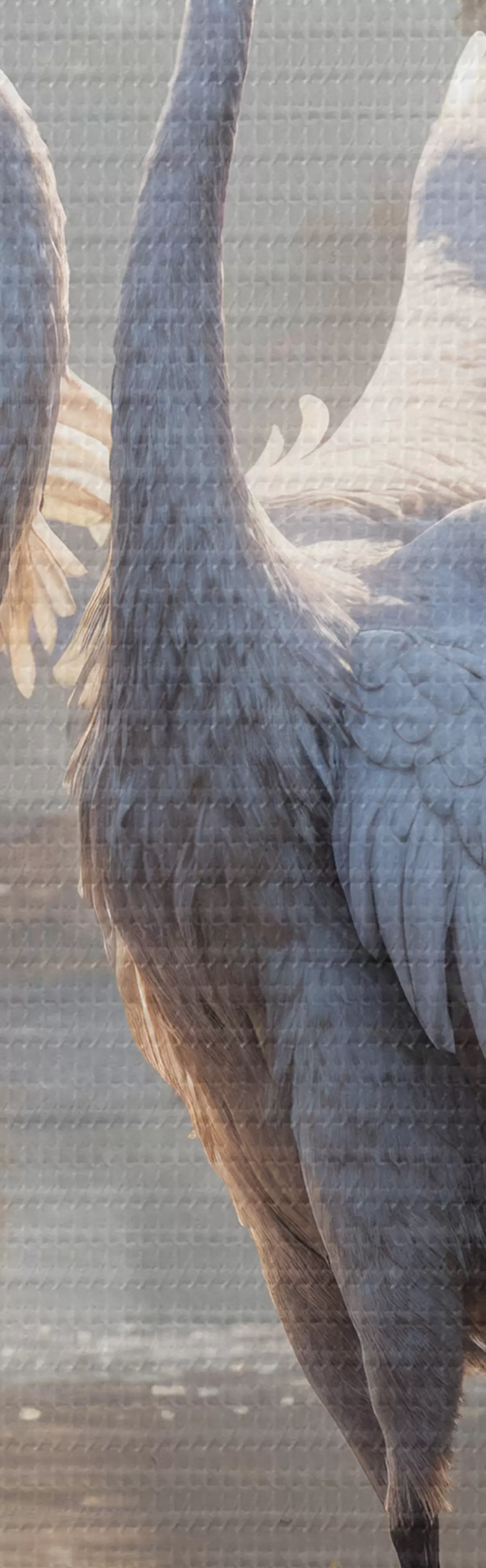 Schilderij Twee grote grijze kraanvogels met lange nekken en gespreide vleugels staan in een mistig meer omgeven door bomen Art. s40404