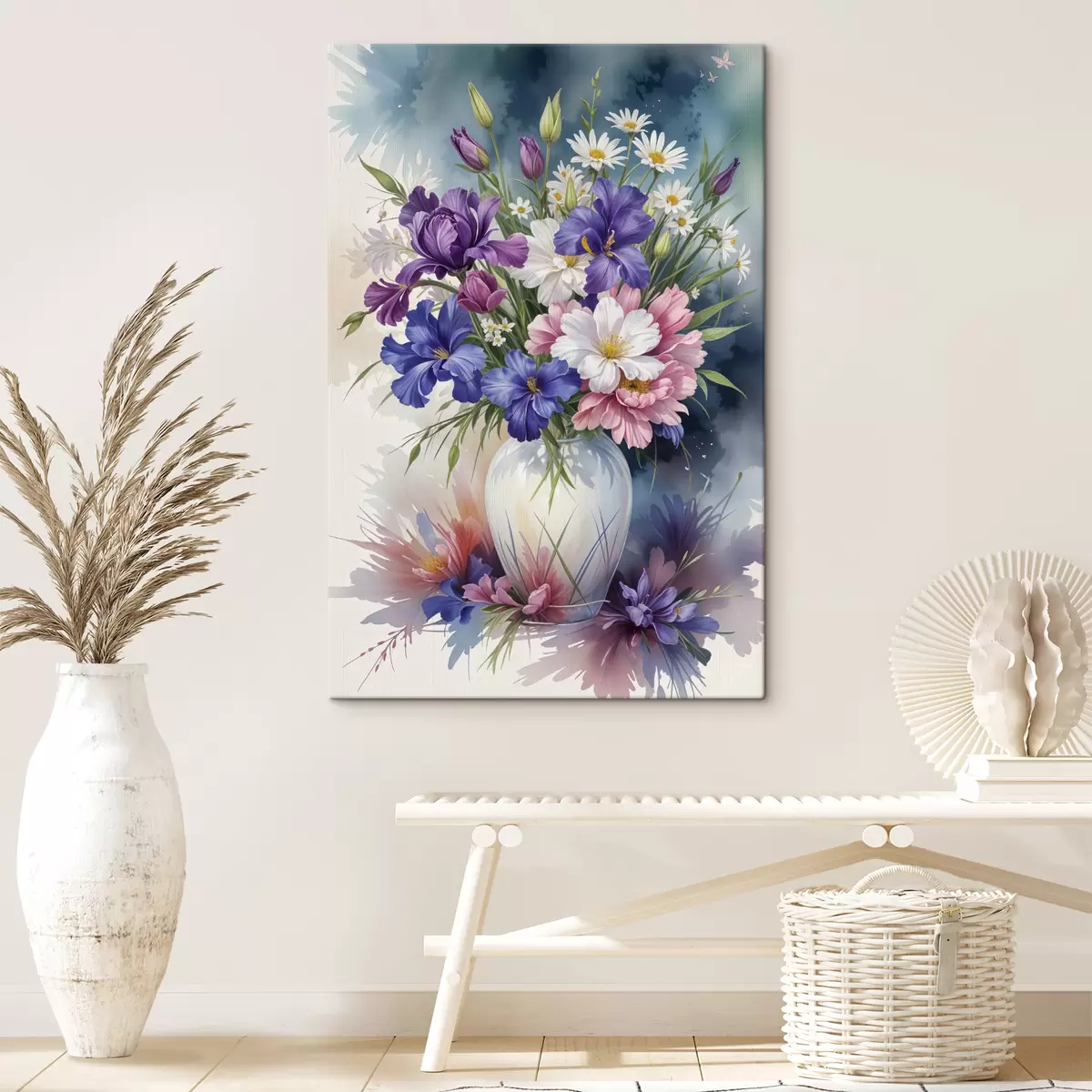 Schilderij Een levendig boeket van kleurrijke paarse irissen, roze madeliefjes en andere bloemen gerangschikt in een witte vaas Art. s40407