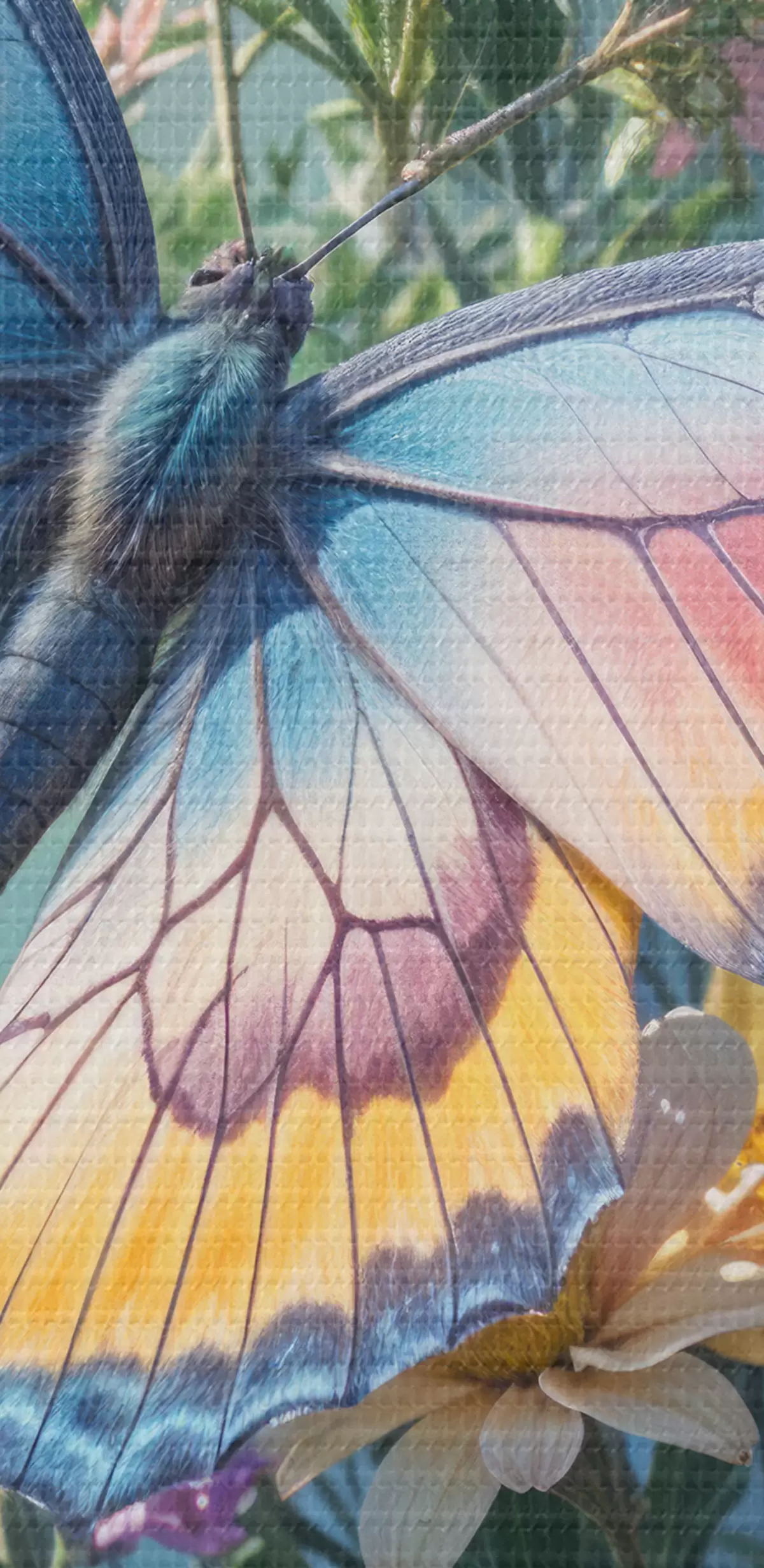 Schilderij Een grote, kleurrijke vlinder zit op een boeket roze en gele bloemen tegen een donkergroene achtergrond Art. s40411
