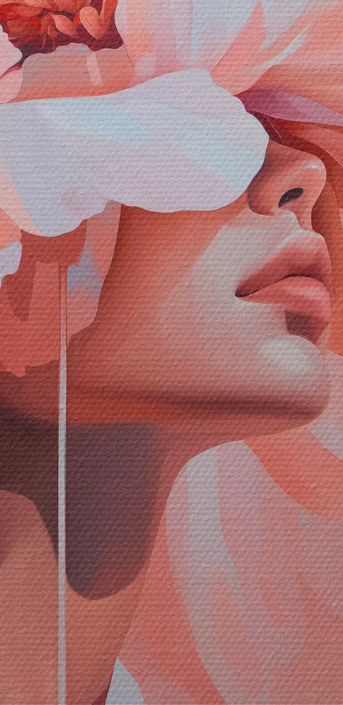 Schilderijen Portret van een vrouw met een grote roze bloem op haar hoofd s40430