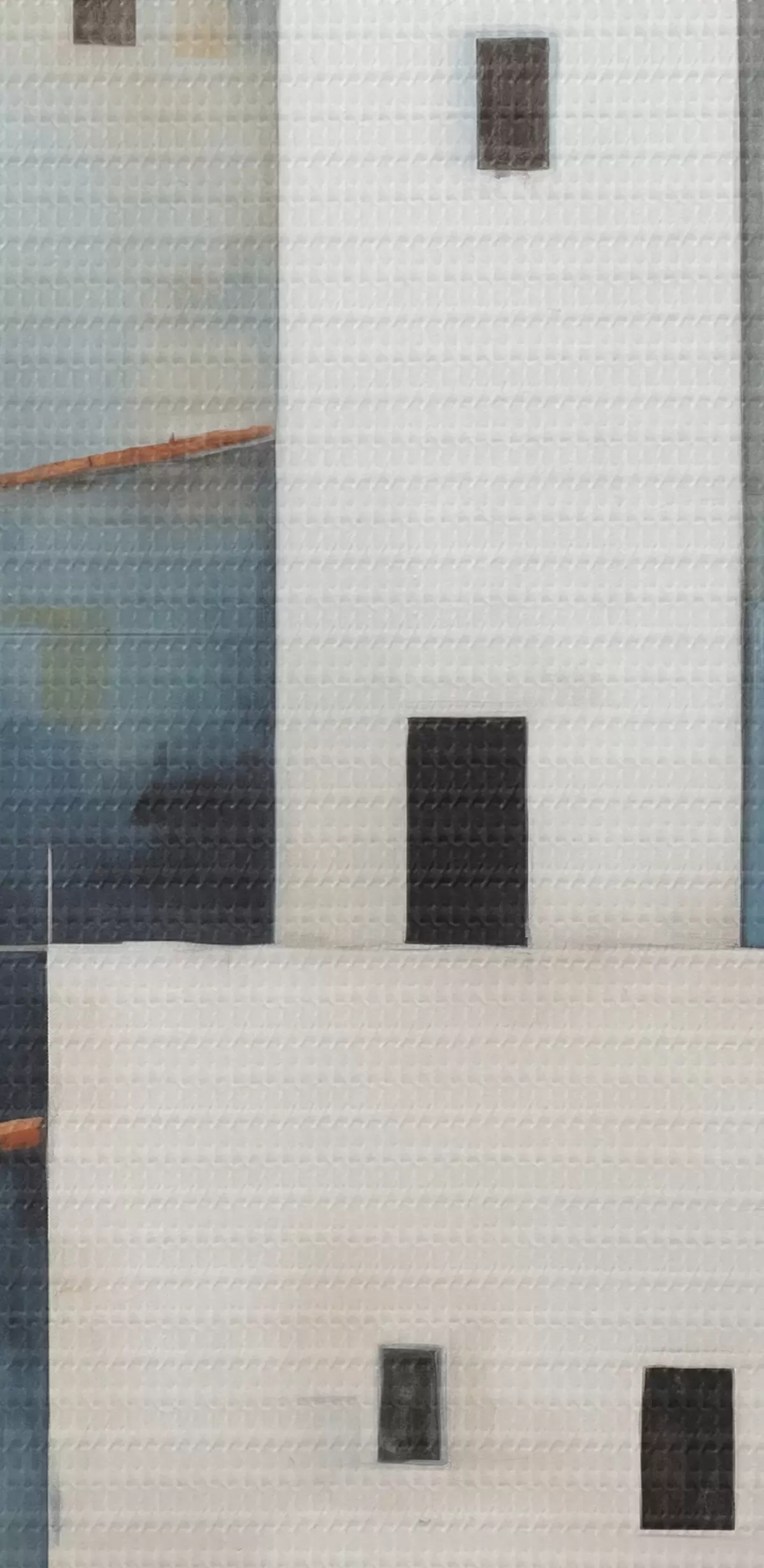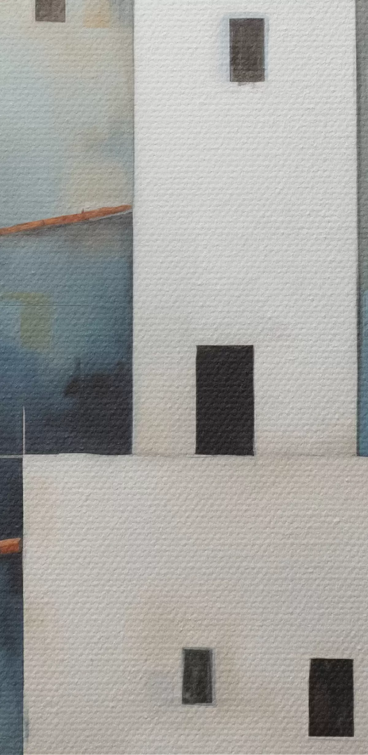 Schilderij Witte gestileerde huizen abstract, rood, oranje, geel, blauwe kleur Art. s40531