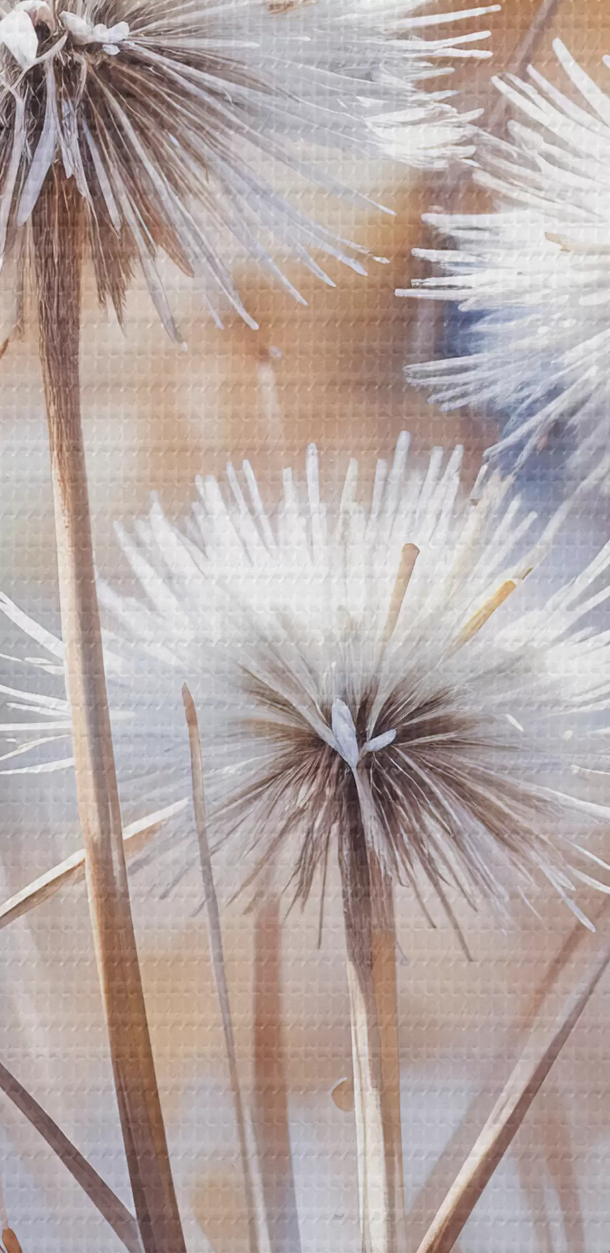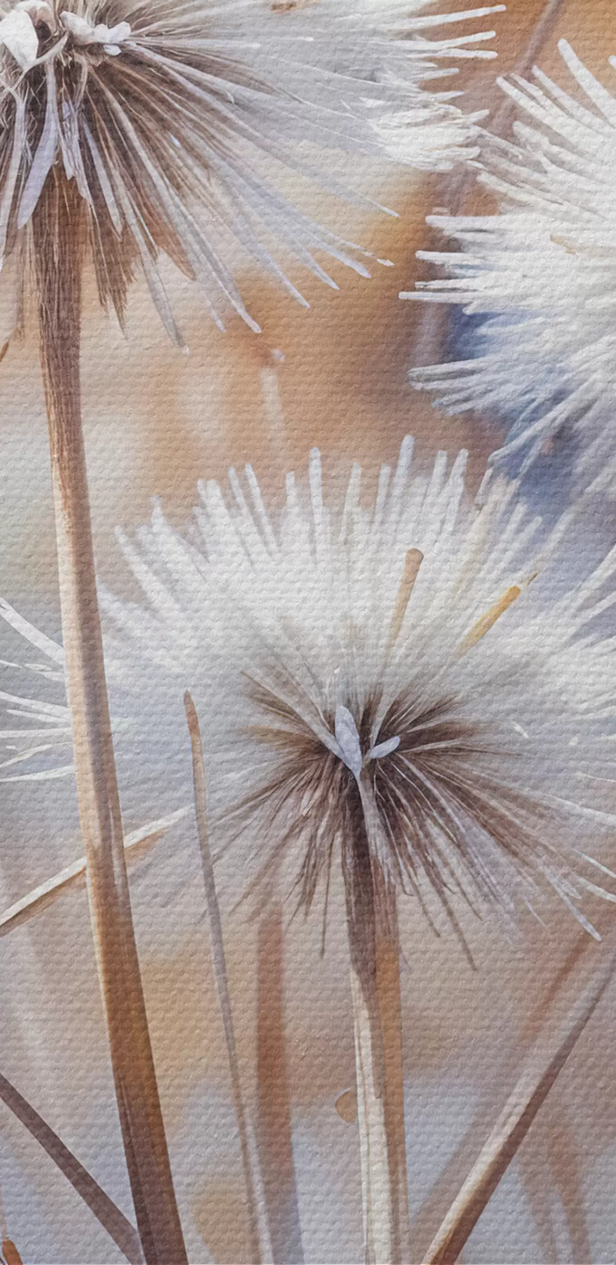 Schilderij Pluizige witte paardenbloembloemen tegen een wazige aquarelachtergrond met warme belichting Art. s40541