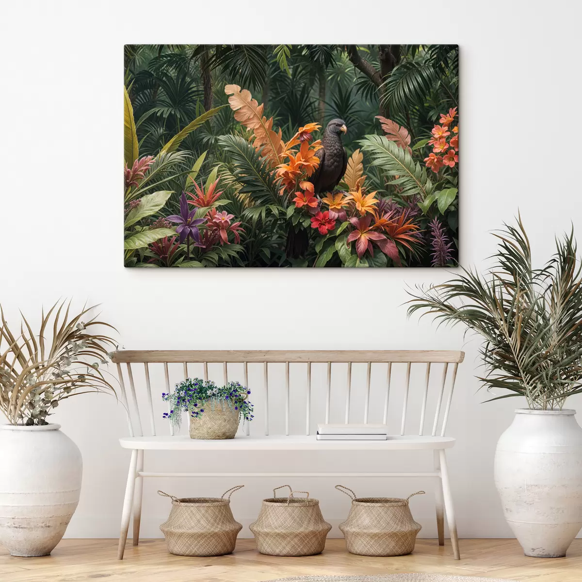 Schilderij Tropische vogel op een tak omringd door levendig gebladerte, palmbladeren, bloemen en exotische planten Art. s40578