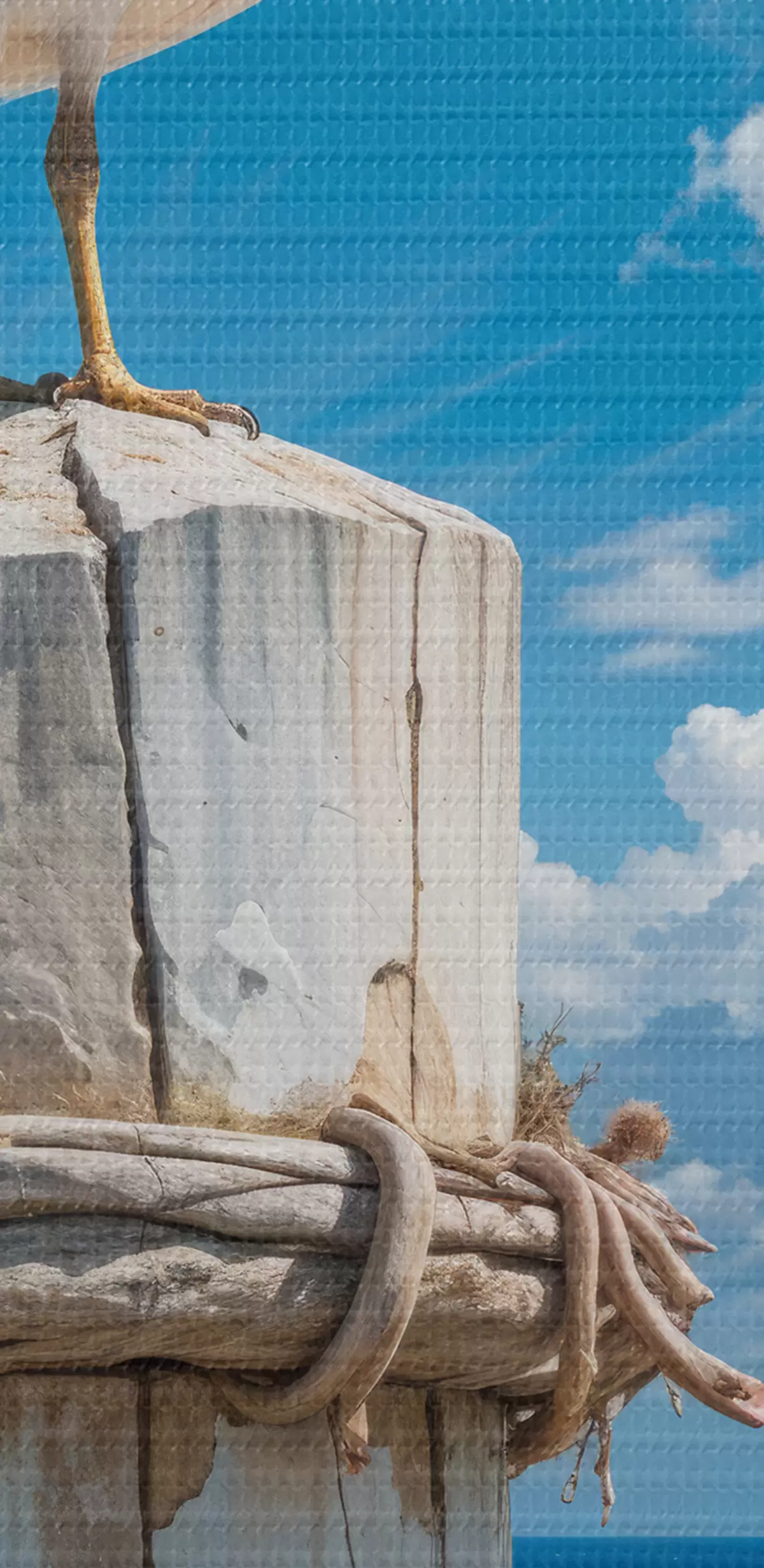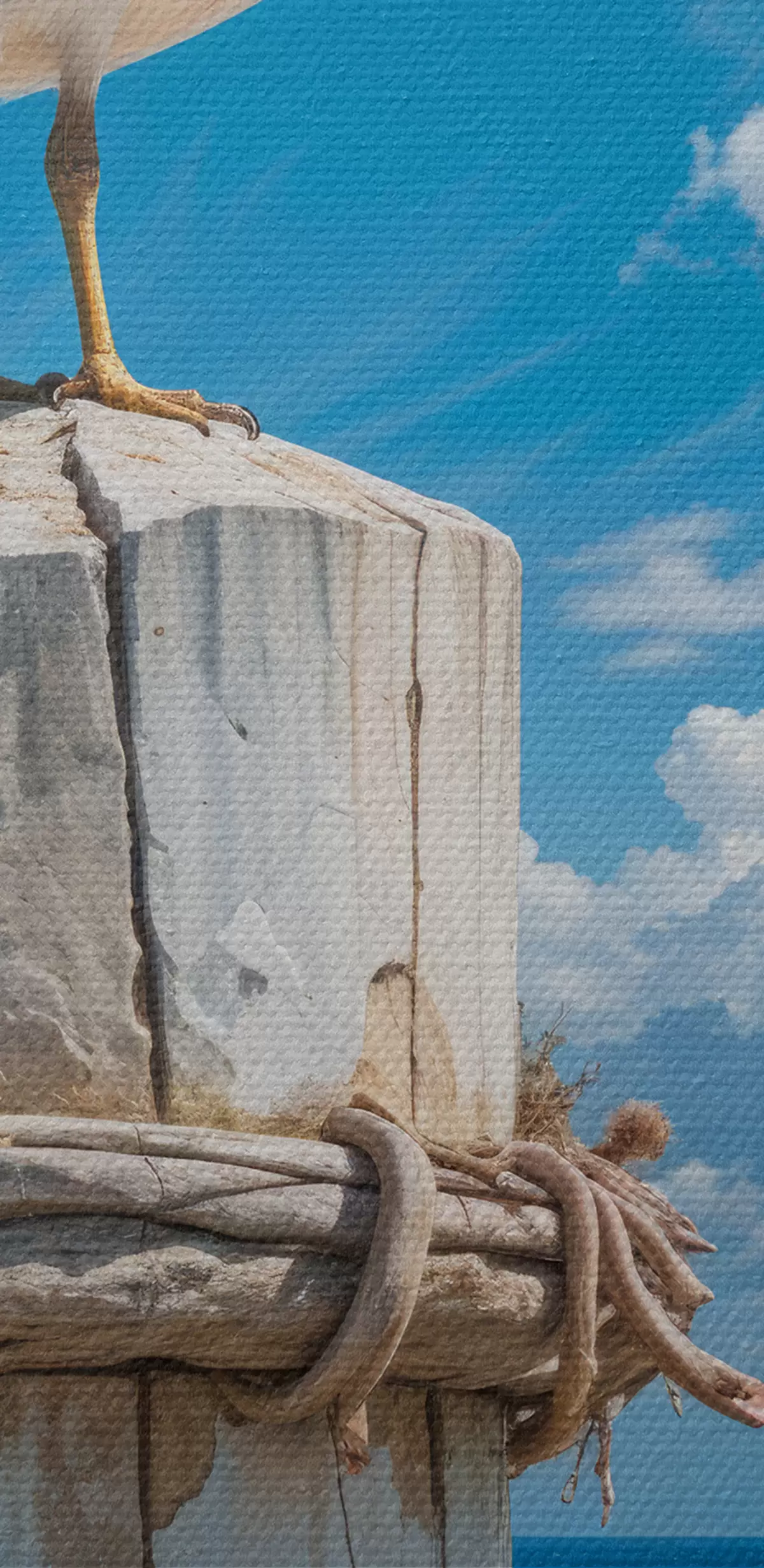 Schilderij Een witte zeemeeuw neergestreken op een houten paal tegen een helderblauwe lucht en oceaan met golven Art. s40590