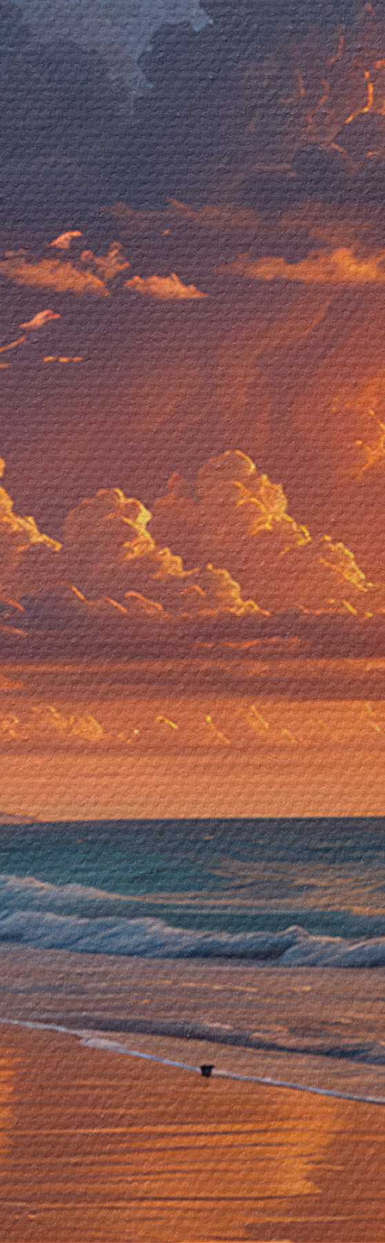 Schilderij Een dramatische zonsondergang boven een tropisch strand, met levendige oranje en roze wolken die weerspiegeld worden in het kalme water Art. s40599