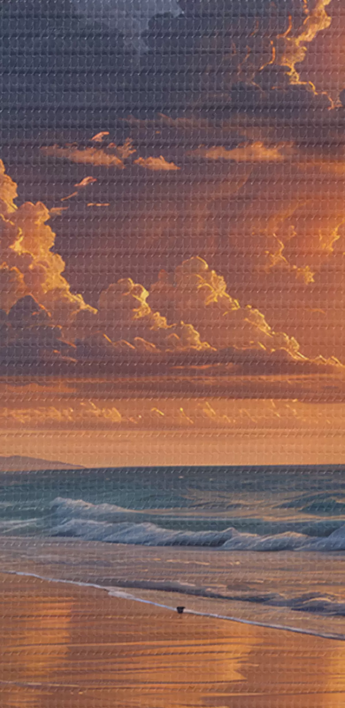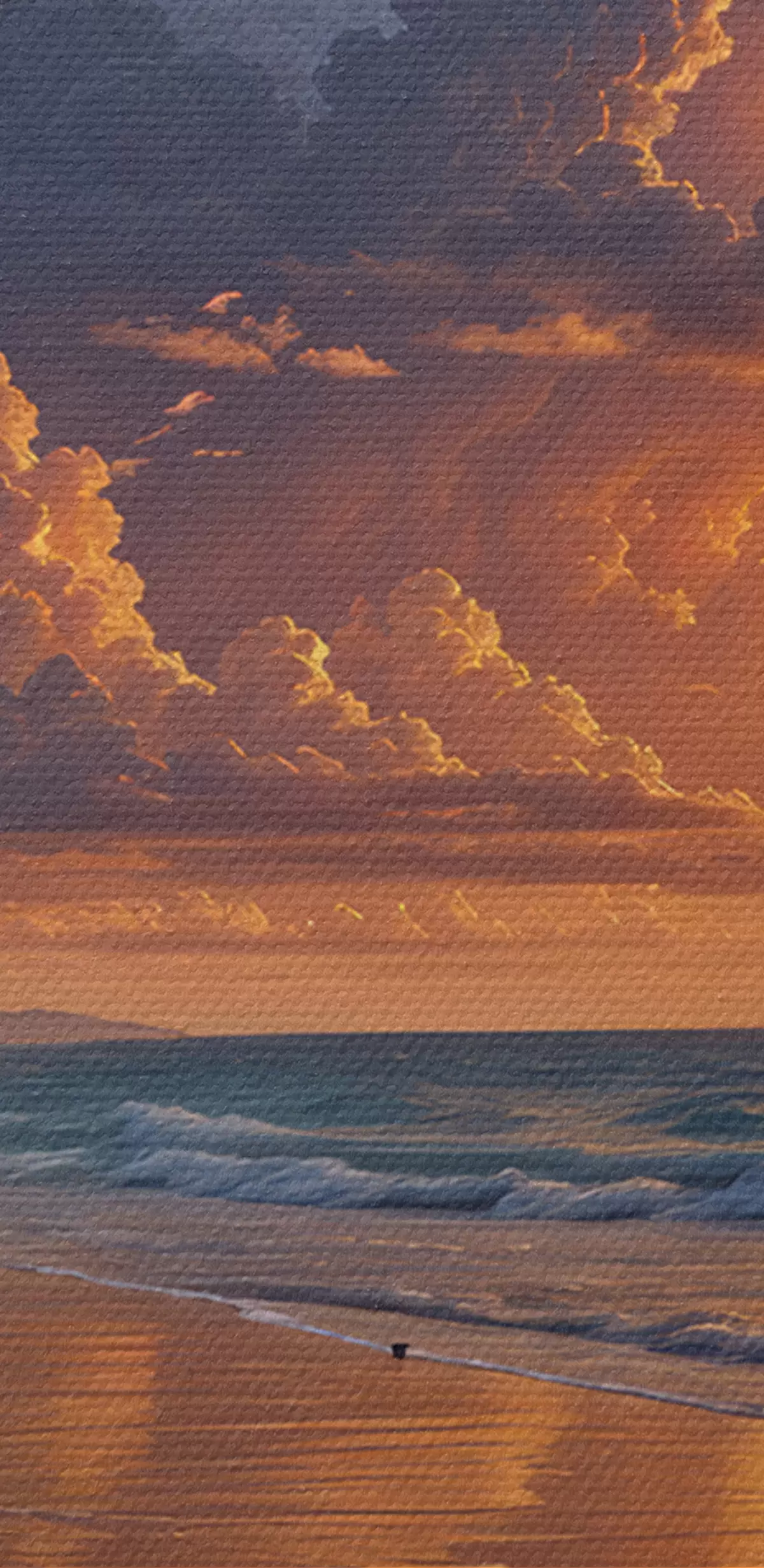 Schilderij Een dramatische zonsondergang boven een tropisch strand, met levendige oranje en roze wolken die weerspiegeld worden in het kalme water Art. s40599