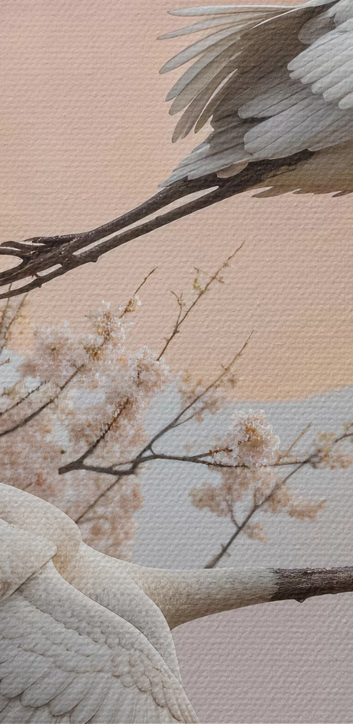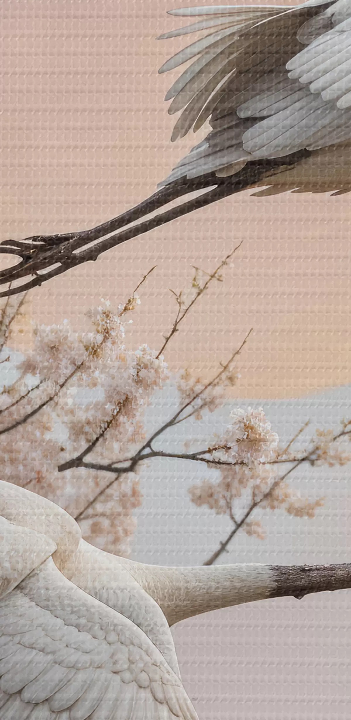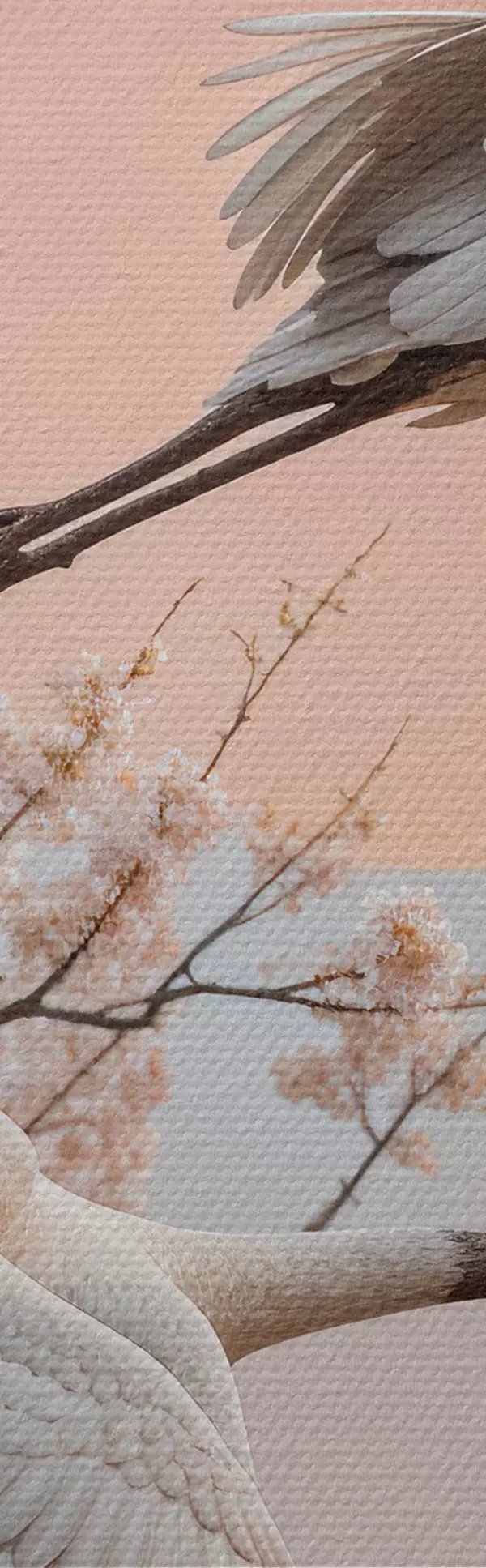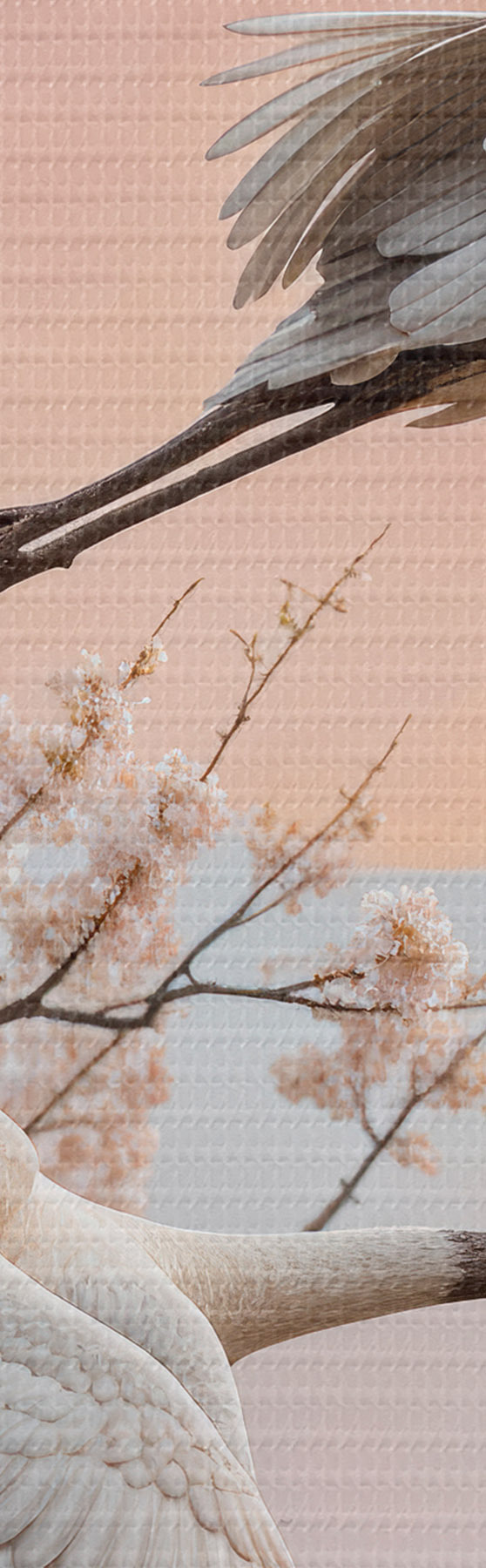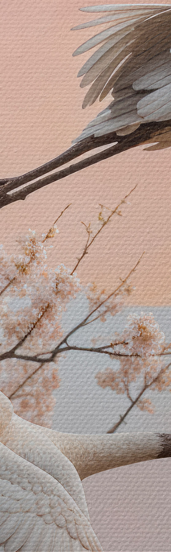 Schilderij Twee witte kraanvogels vliegen tussen de bloeiende kersenbloesembomen tegen een roze ondergaande zon Art. s40601