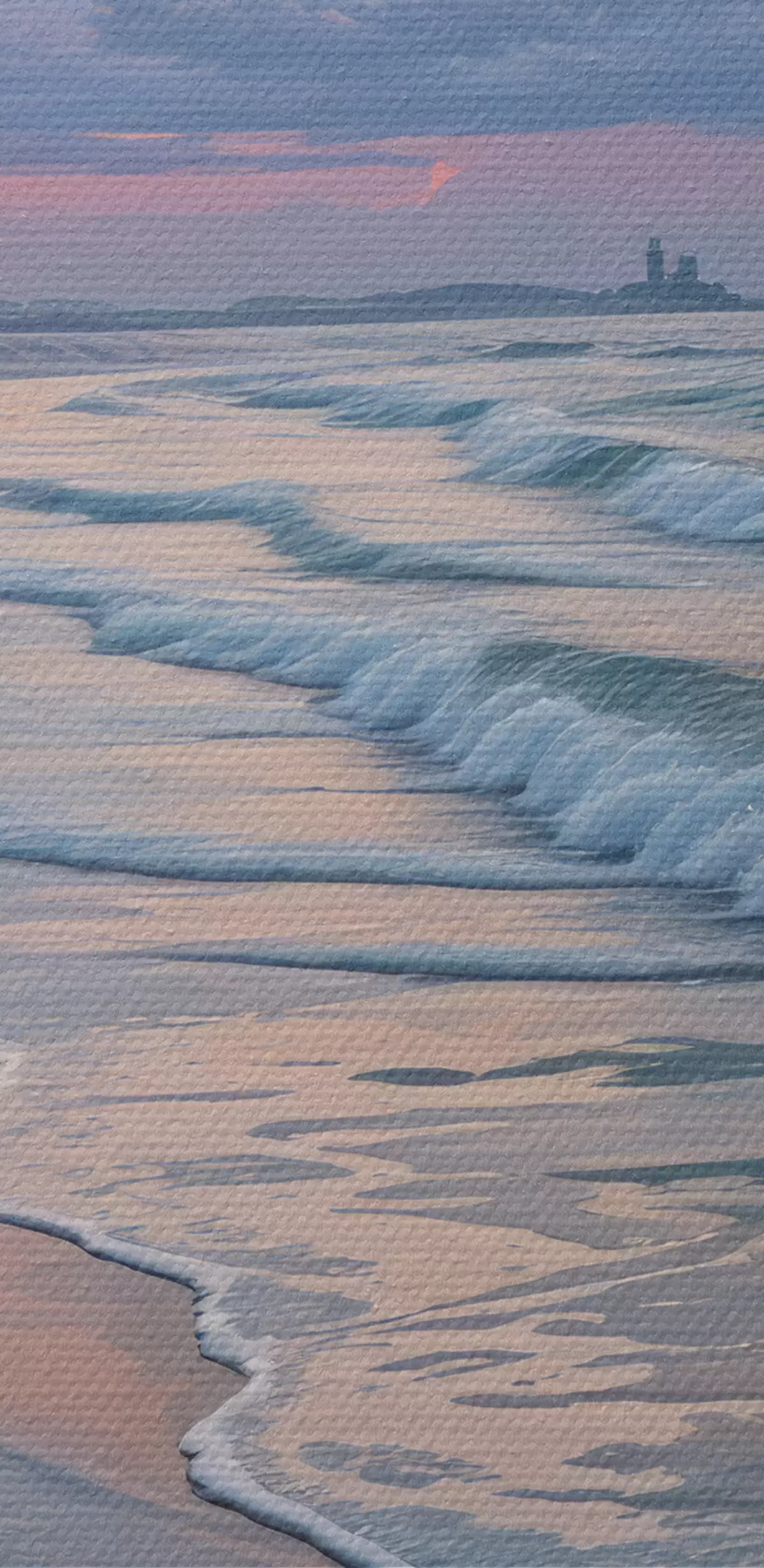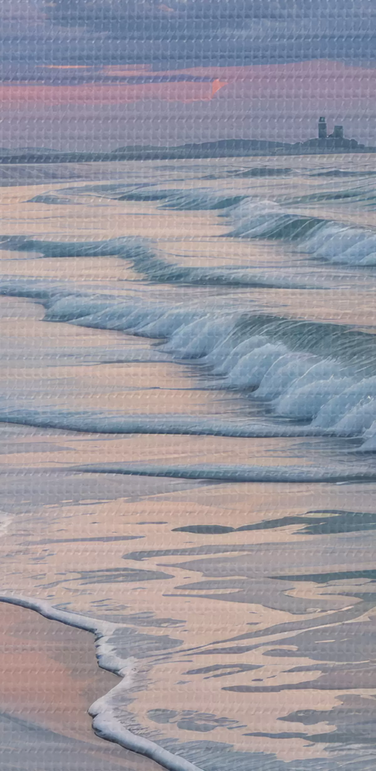 Schilderij Een serene strandscène bij zonsondergang, met zachte golven die tegen het zand kabbelen Art. s40606