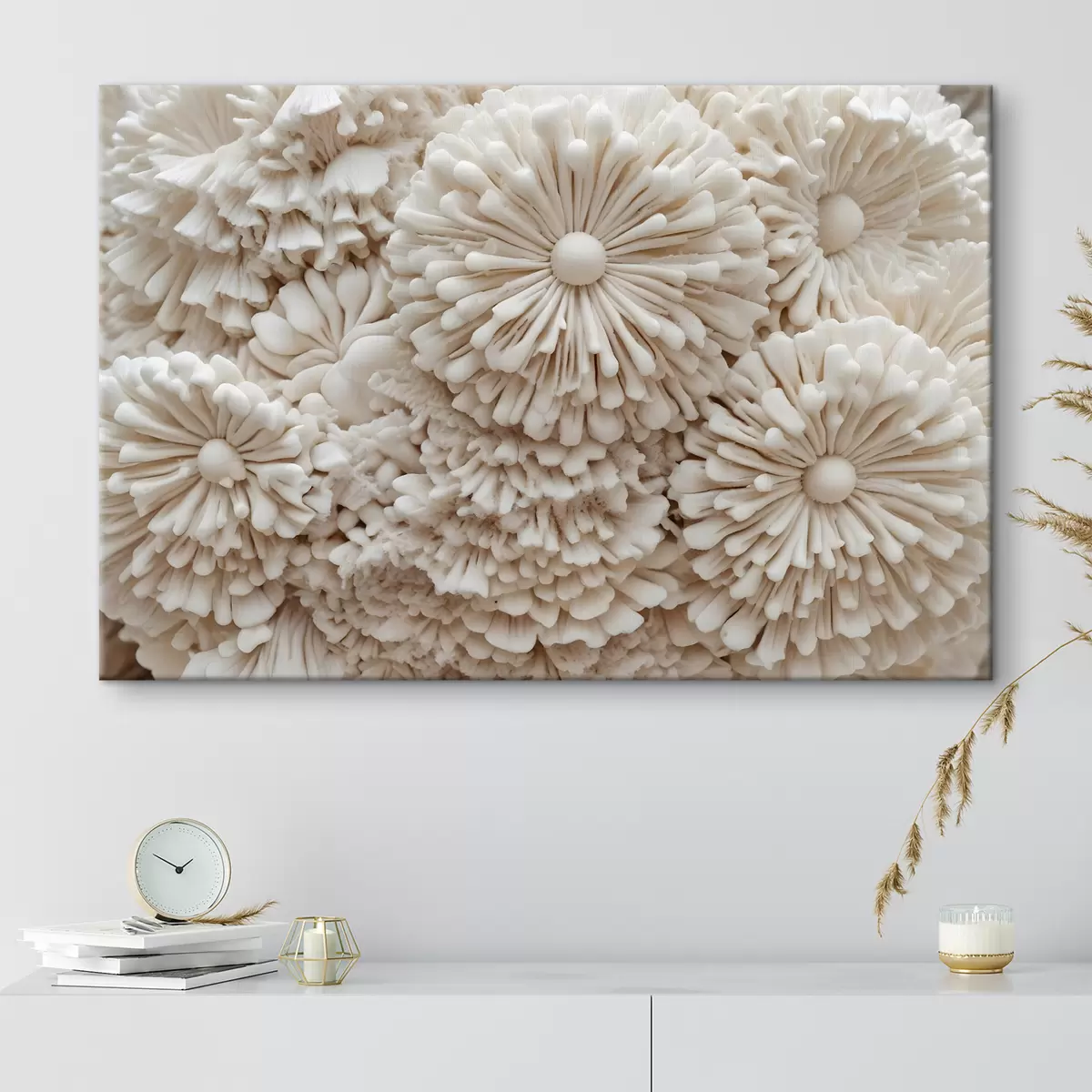 Schilderij Een close-up van een cluster delicate, crèmekleurige koraalachtige structuren die een zachte textuurprint creëren Art. s40614