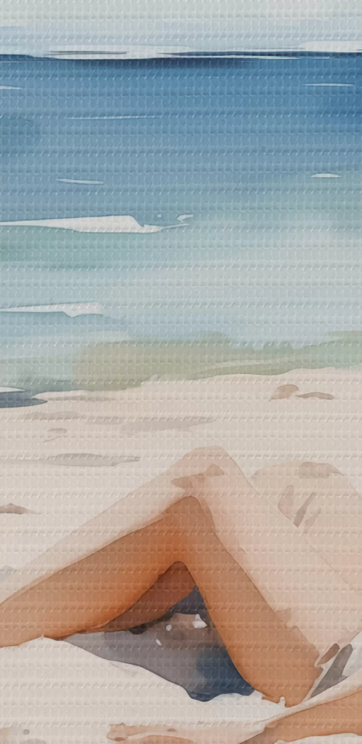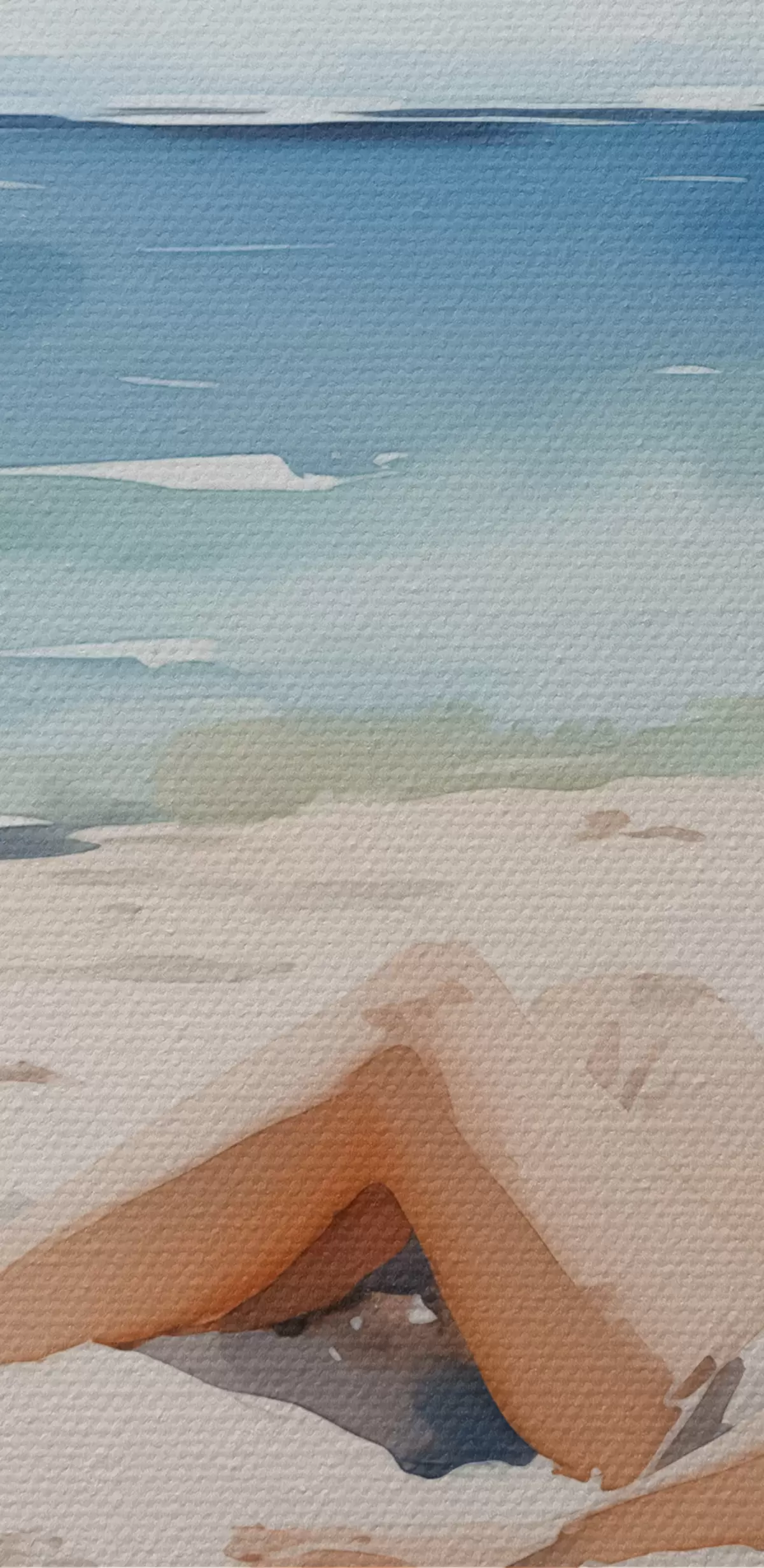 Schilderij Meisje ontspannend op het strand bij de zee aquarel Art. s40679
