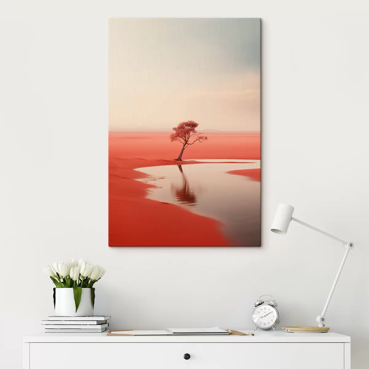 Schilderijen Minimalistisch landschap boom bij de rivier, rode, grijze kleur s40722