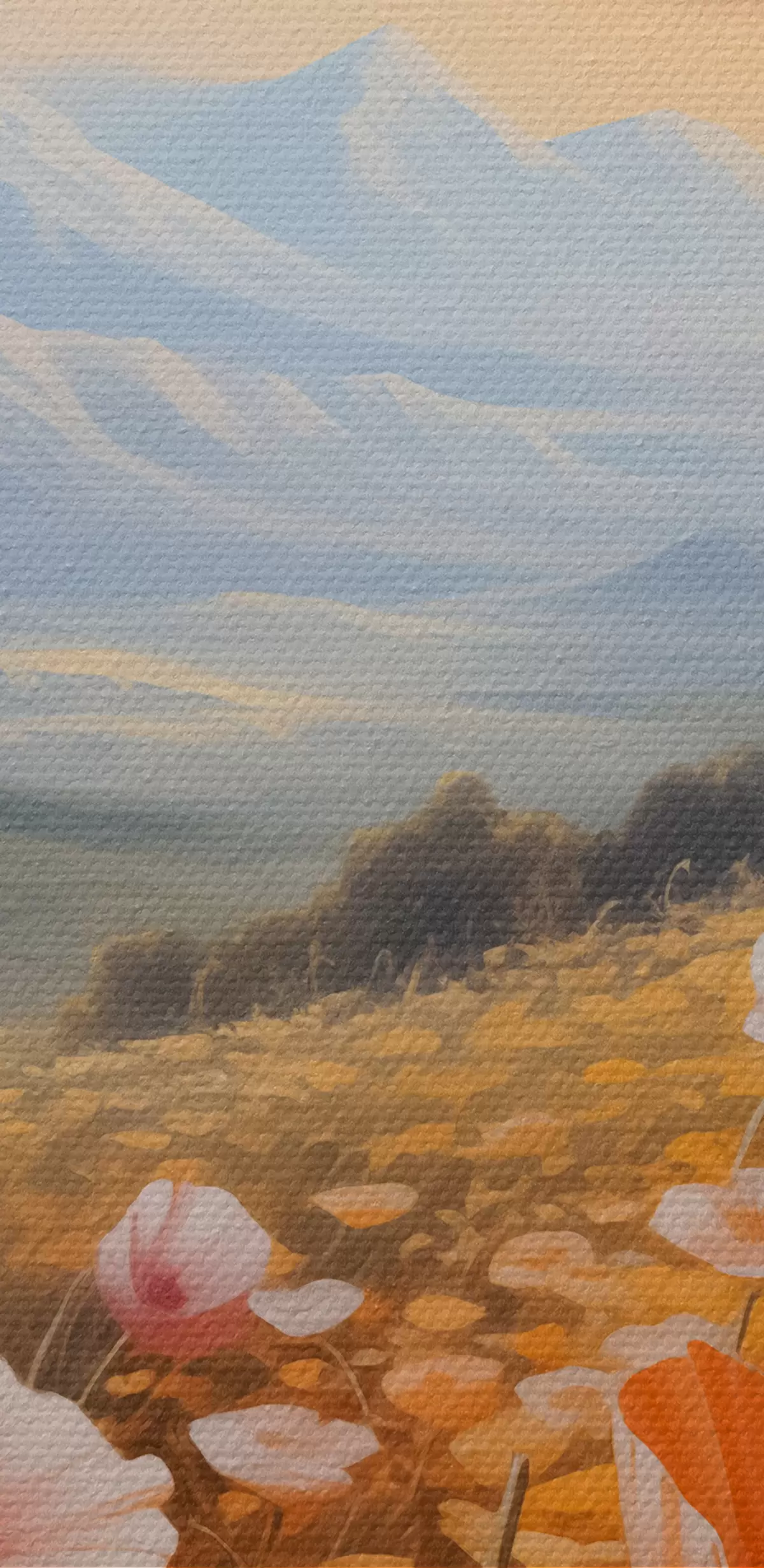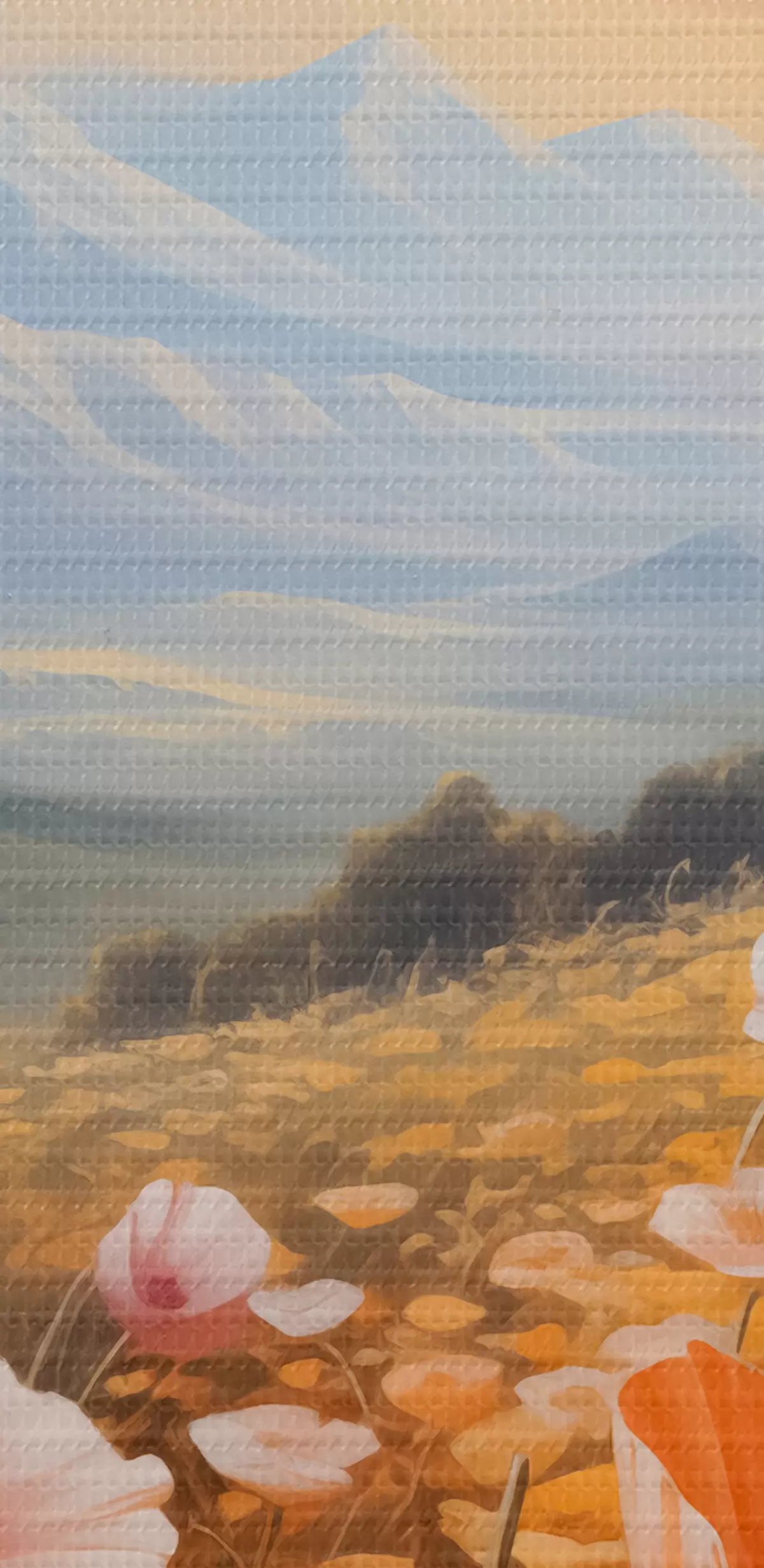 Schilderij Klaprozenveld bij zonsopgang met bergen op de achtergrond Art. s40730