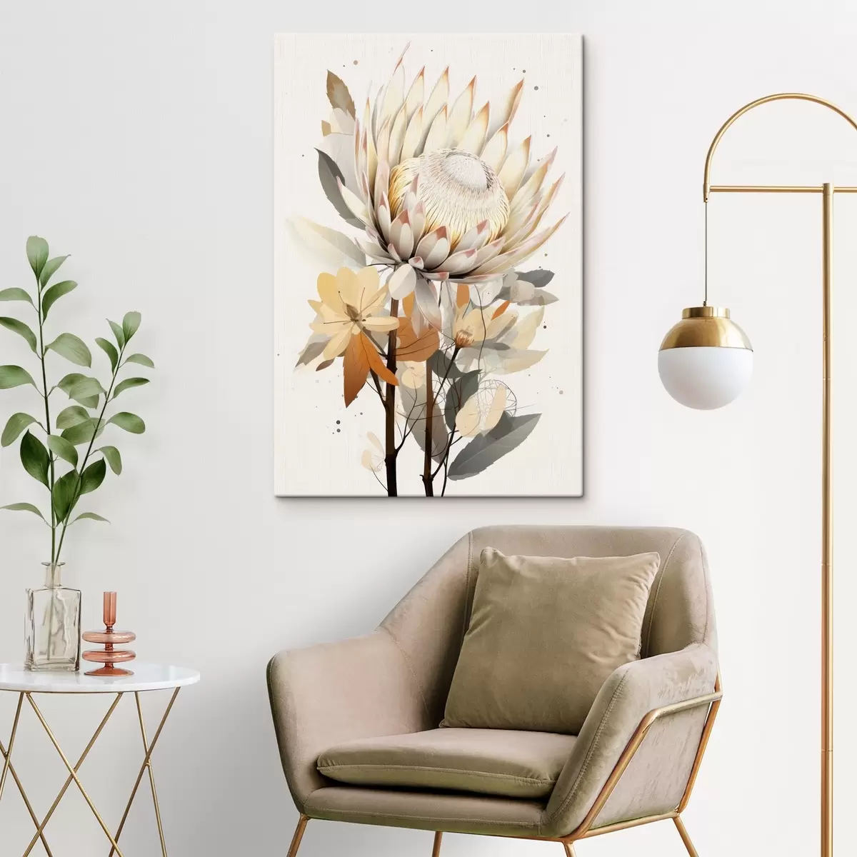 Schilderij Prachtige protea bloemen met weelderige bladeren, zachte beige kleuren, katoen Art. s40817
