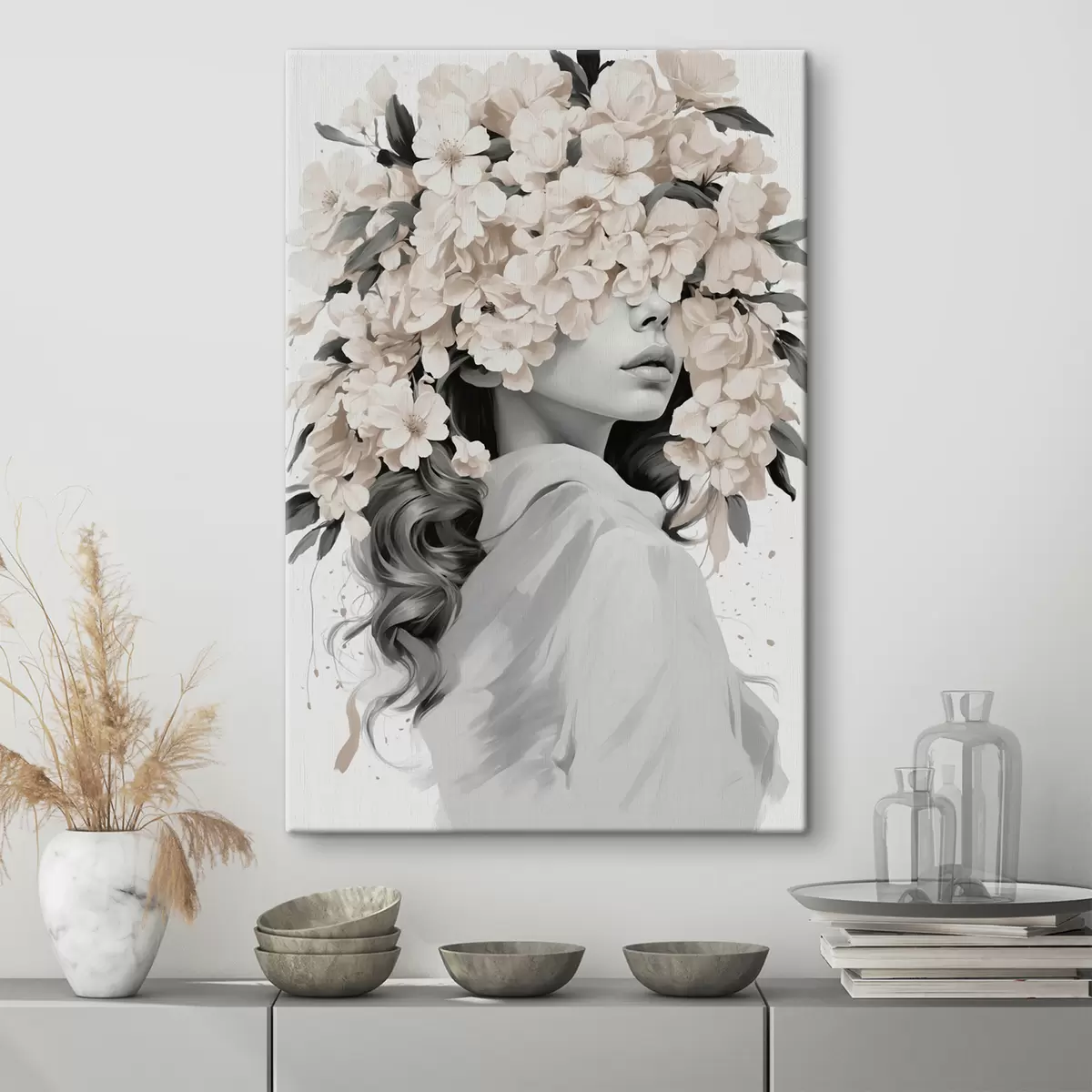 Schilderij Meisje met bloemen op haar gezicht in zwarte en witte kleuren Art. s40849