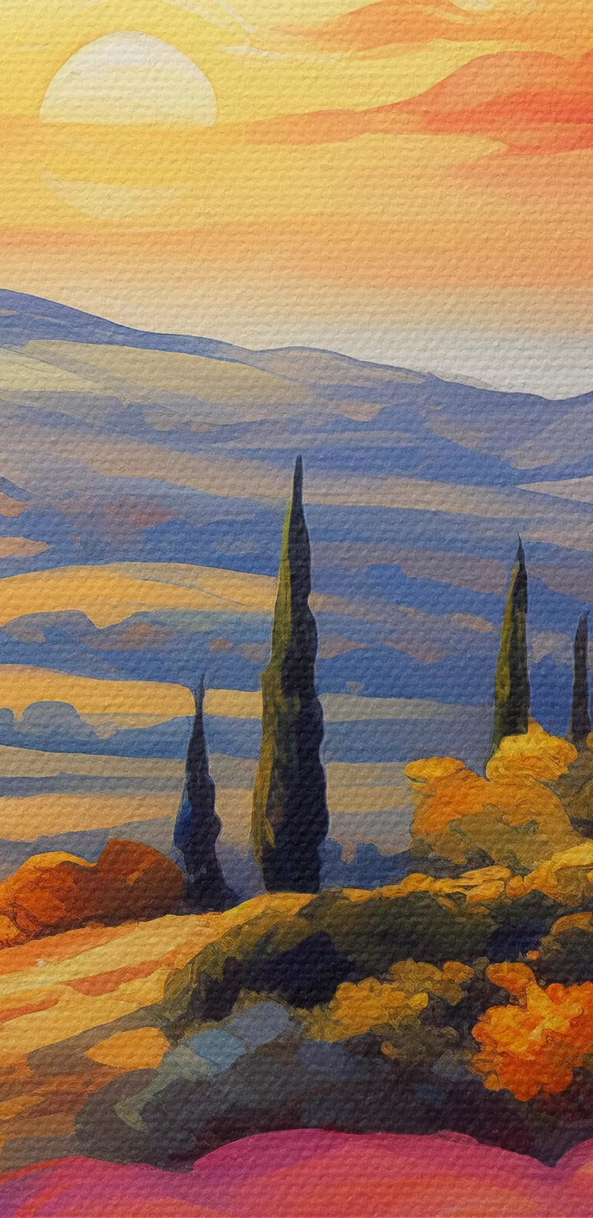 Schilderij Toscana zonsondergang, lavendelvelden, prachtige landschappen, aquarel Art. s40942