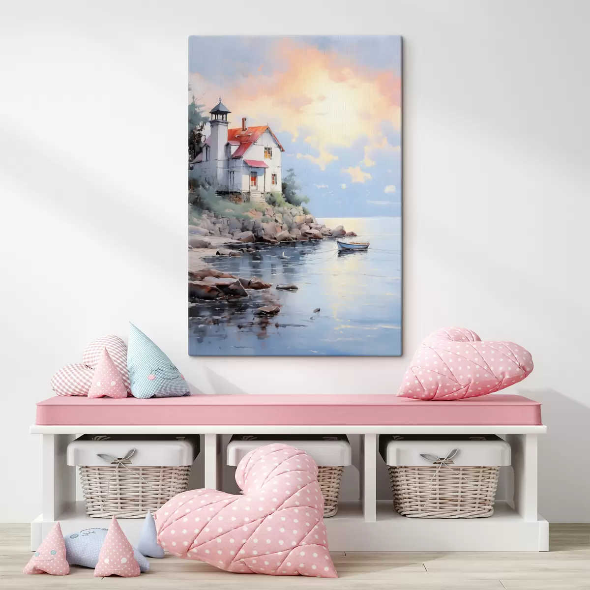 Schilderij Huis op het strand aan zee bij zonsondergang Art. s41010