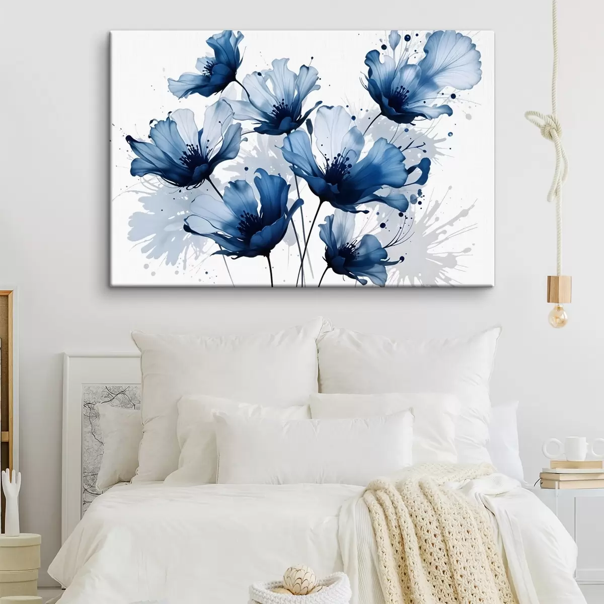 Schilderij Abstracte grote blauwe en witte bloemen met zachte, spetterende wazige bloemblaadjes tegen een witte achtergrond Art. s41082