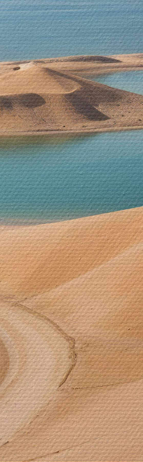 Schilderijen Een uitgestrekt woestijnlandschap met glooiende zandduinen en turquoise meren, omringd door ruige bergen s41087