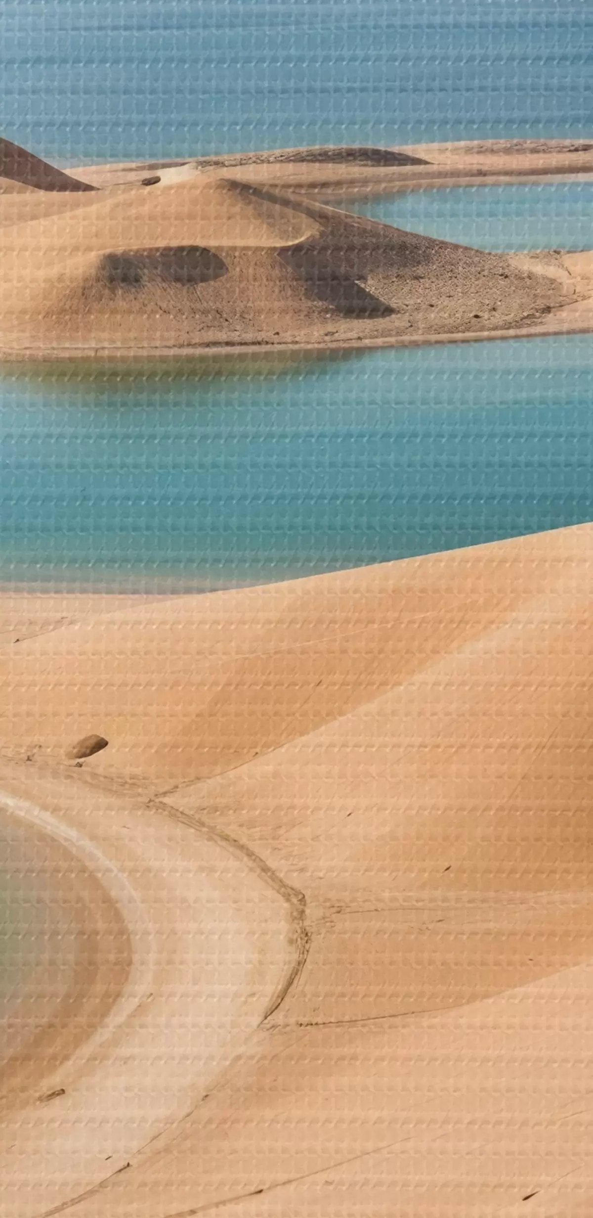 Schilderij Een uitgestrekt woestijnlandschap met glooiende zandduinen en turquoise meren, omringd door ruige bergen Art. s41087