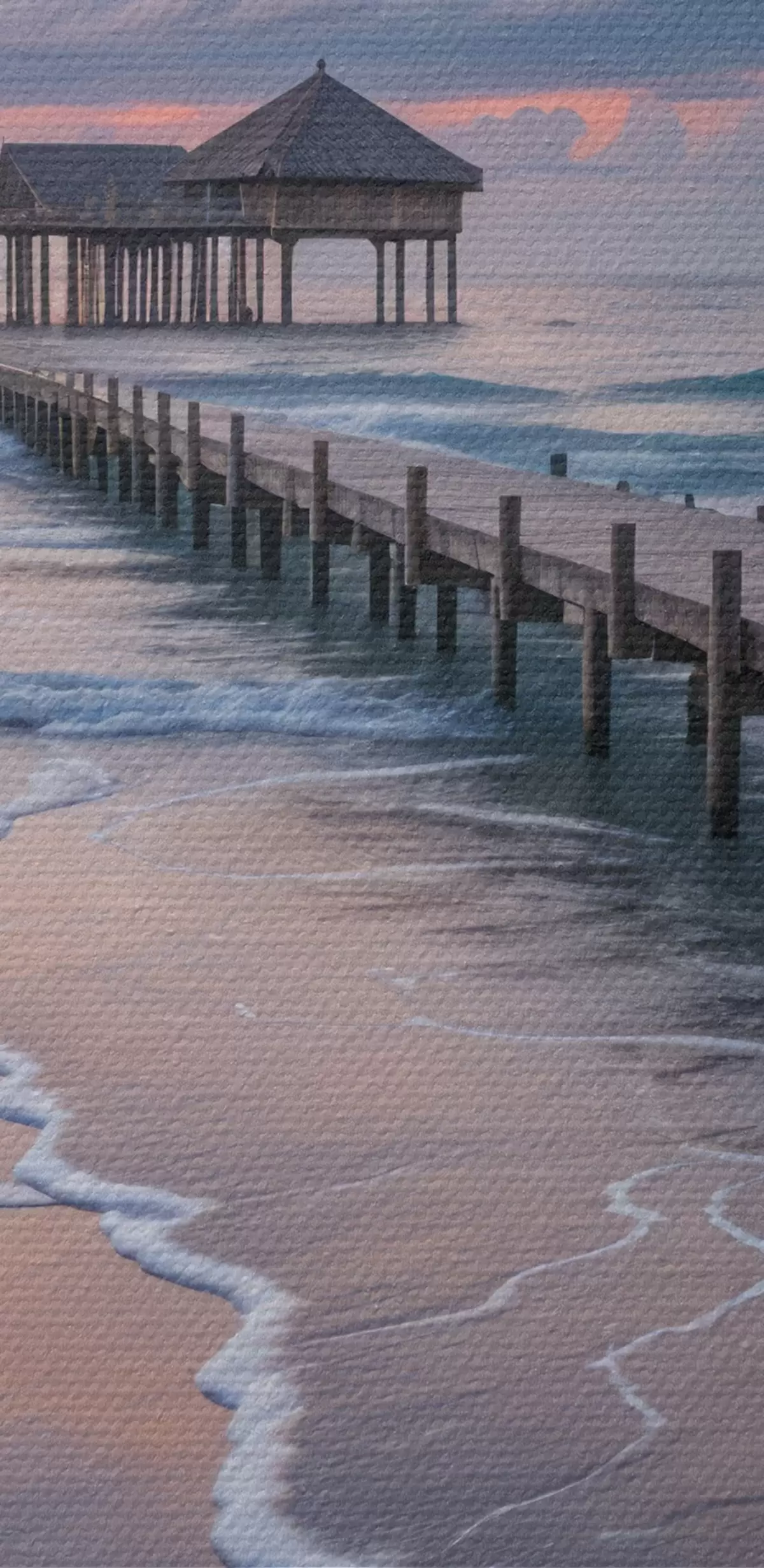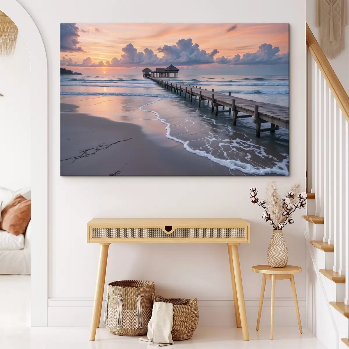 Schilderij Een houten pier die zich uitstrekt in een kalme oceaan bij zonsondergang met kleurrijke wolken Art. s41091