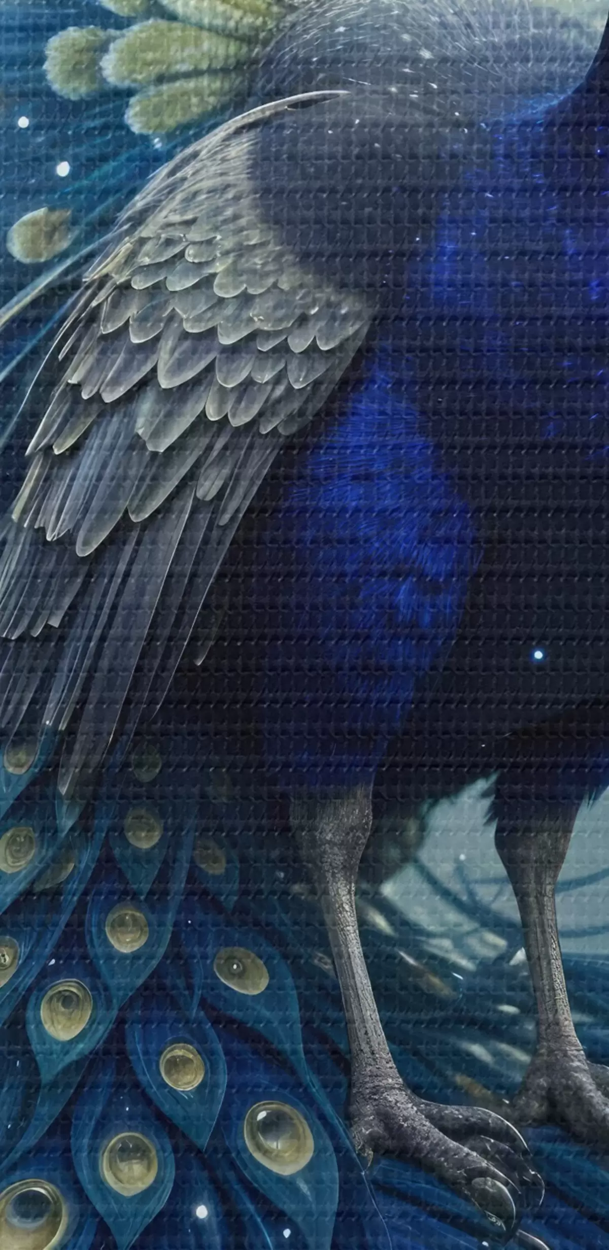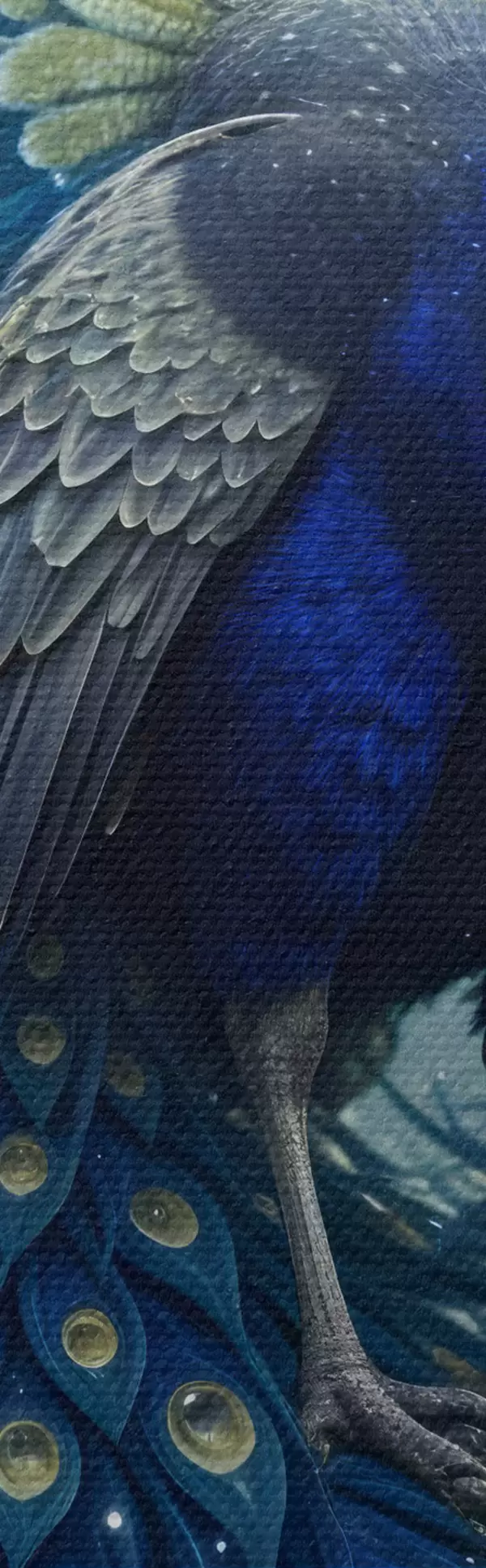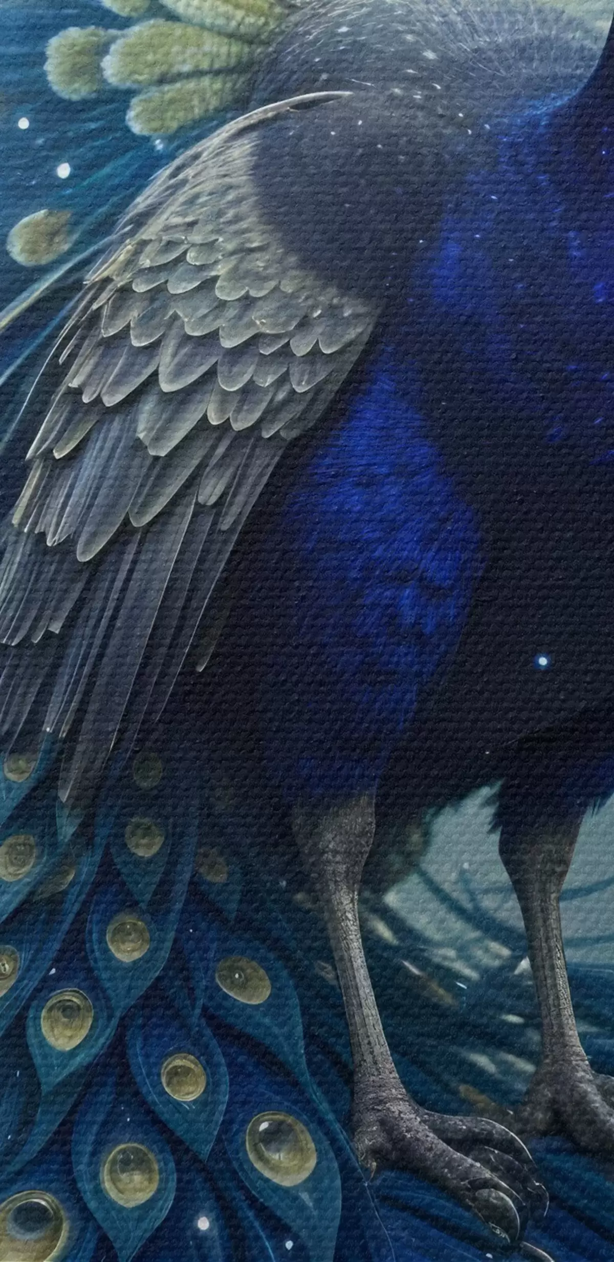 Schilderij Een levendige en majestueuze pauw tegen een sterrenhemel, die een magische en etherische sfeer creëert Art. s41256