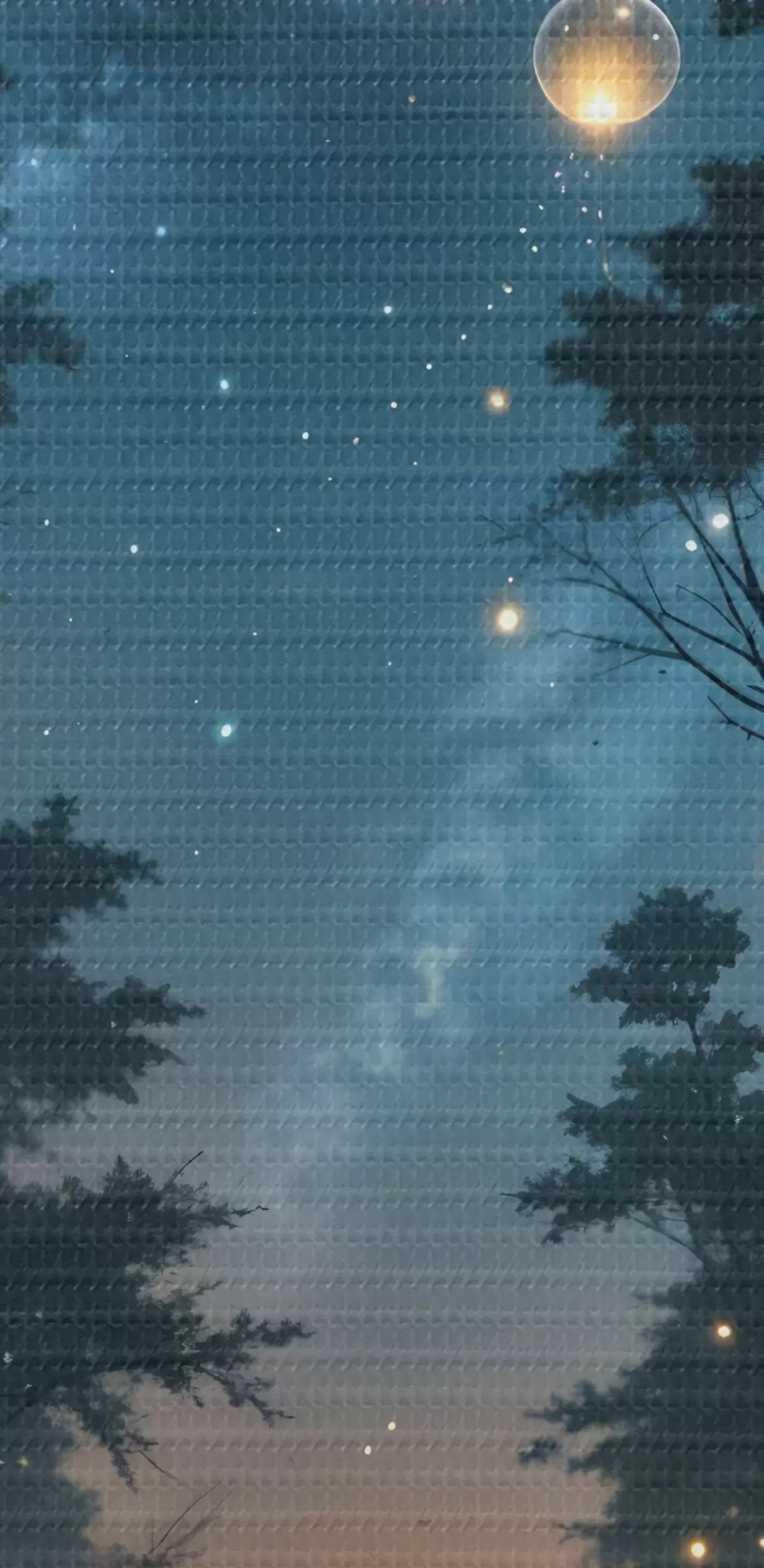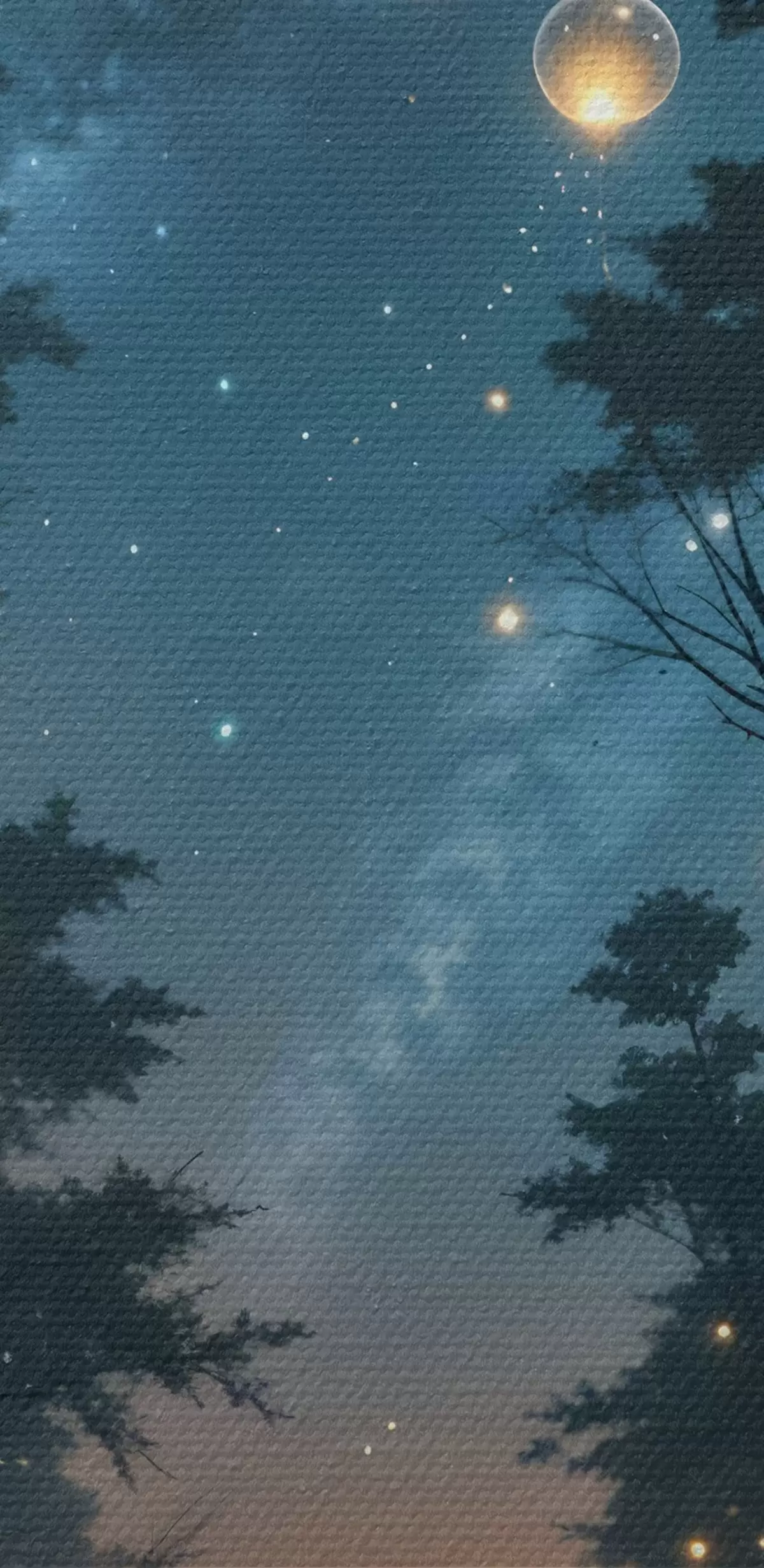Schilderij Een magisch bos bij nacht met gele lichtbollen en vuurvliegjes die tussen de bomen zweven en een grillige sfeer creëren Art. s41259