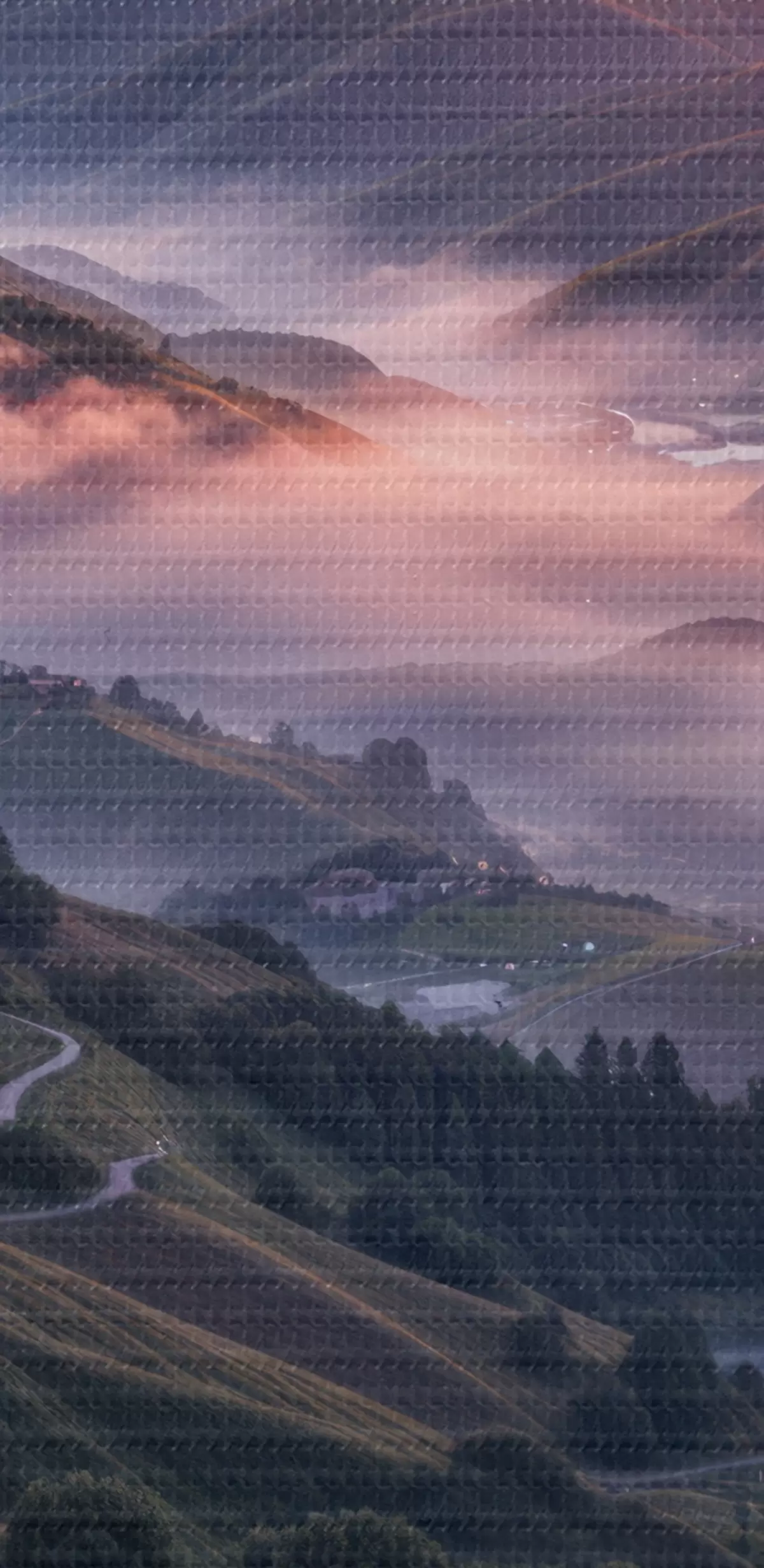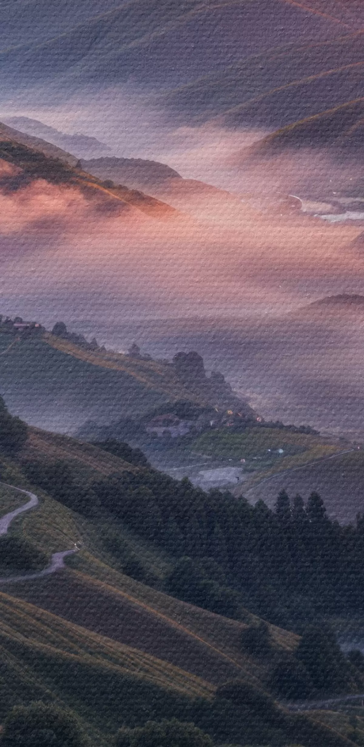 Schilderij Een adembenemend landschap met een levendige zonsondergang boven een bergachtig gebied met trossen roze bloemen Art. s41263