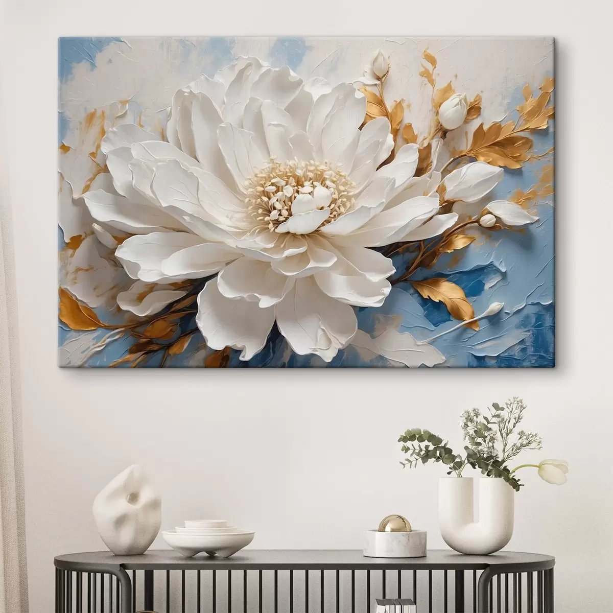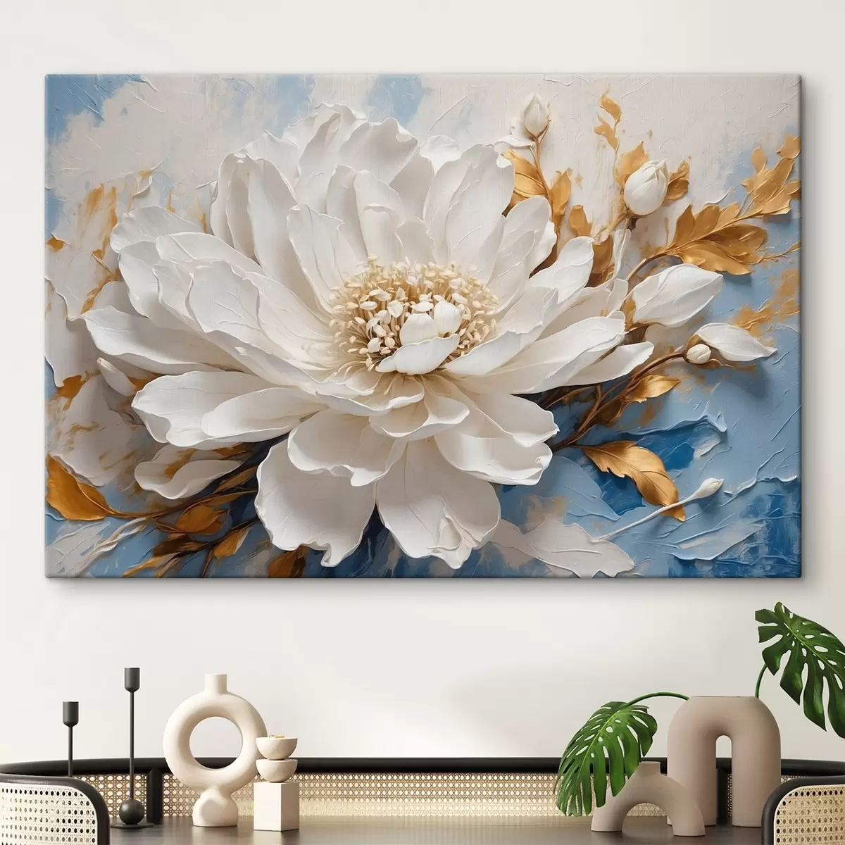 Schilderij Witte bloem op blauw-witte achtergrond Art. s41311