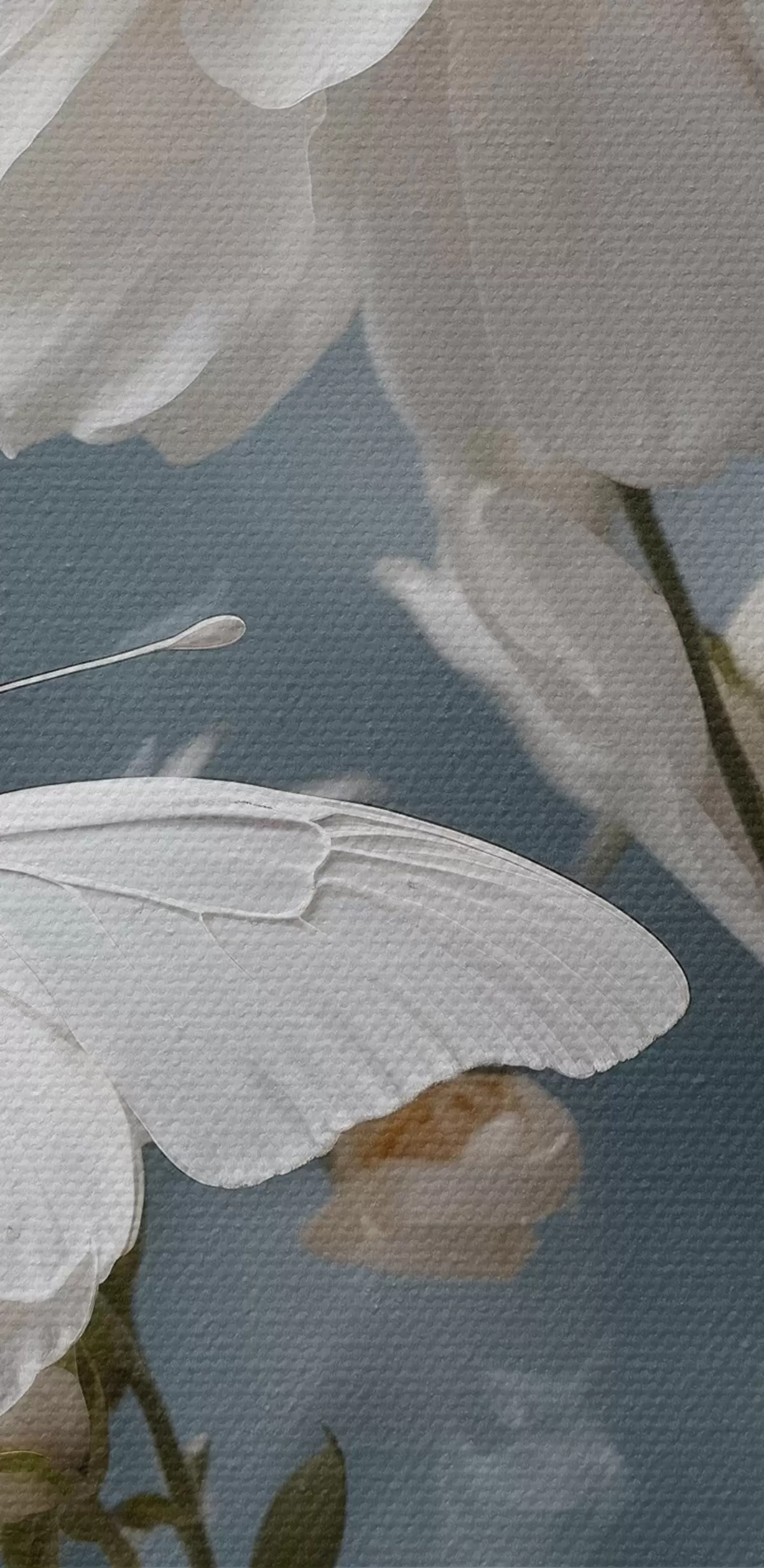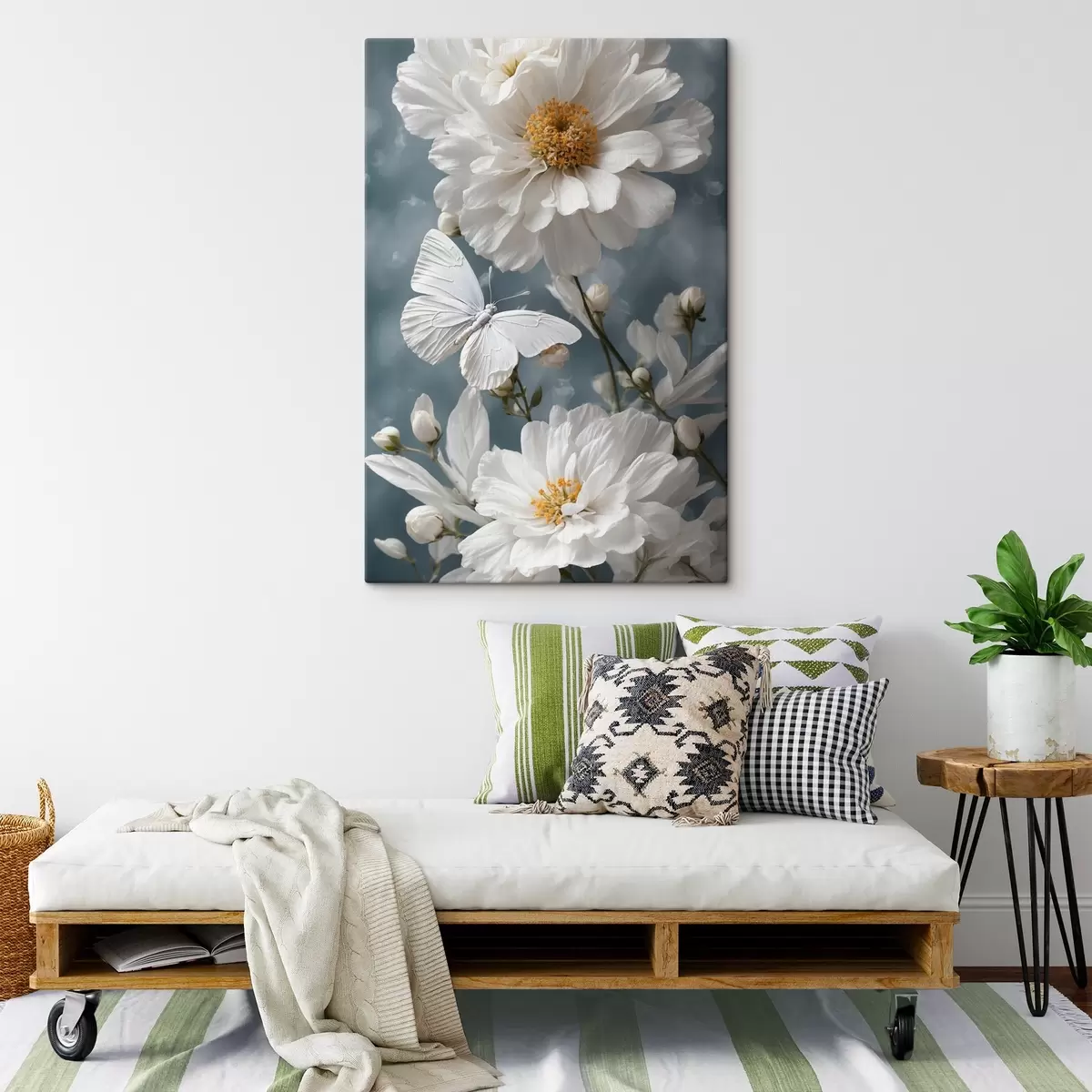 Schilderij Witte bloemen en vlinder op wazige achtergrond Art. s41312