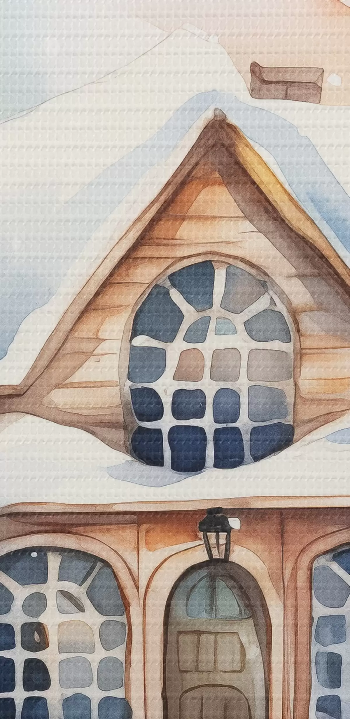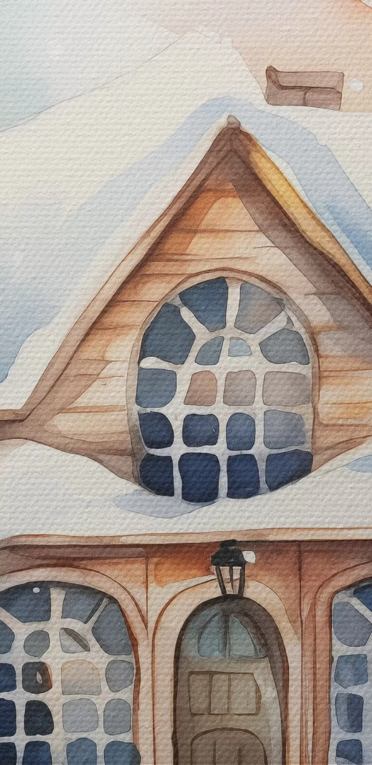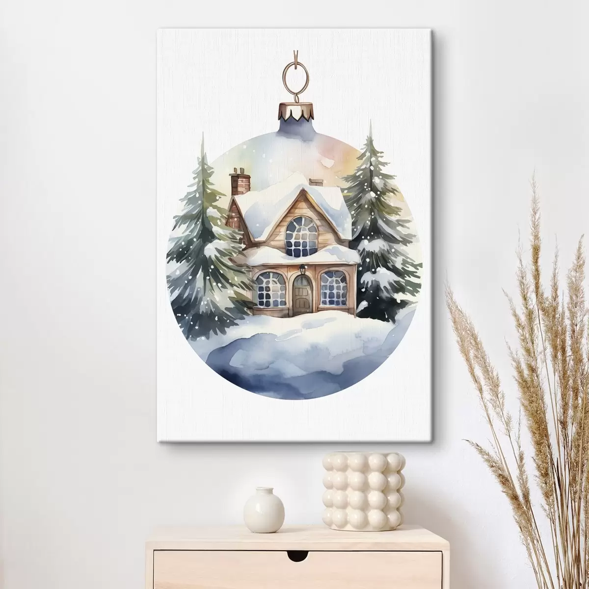 Schilderij Decoratieve kerstbal met aquarel huis in de sneeuw, dennenbomen Art. s41363