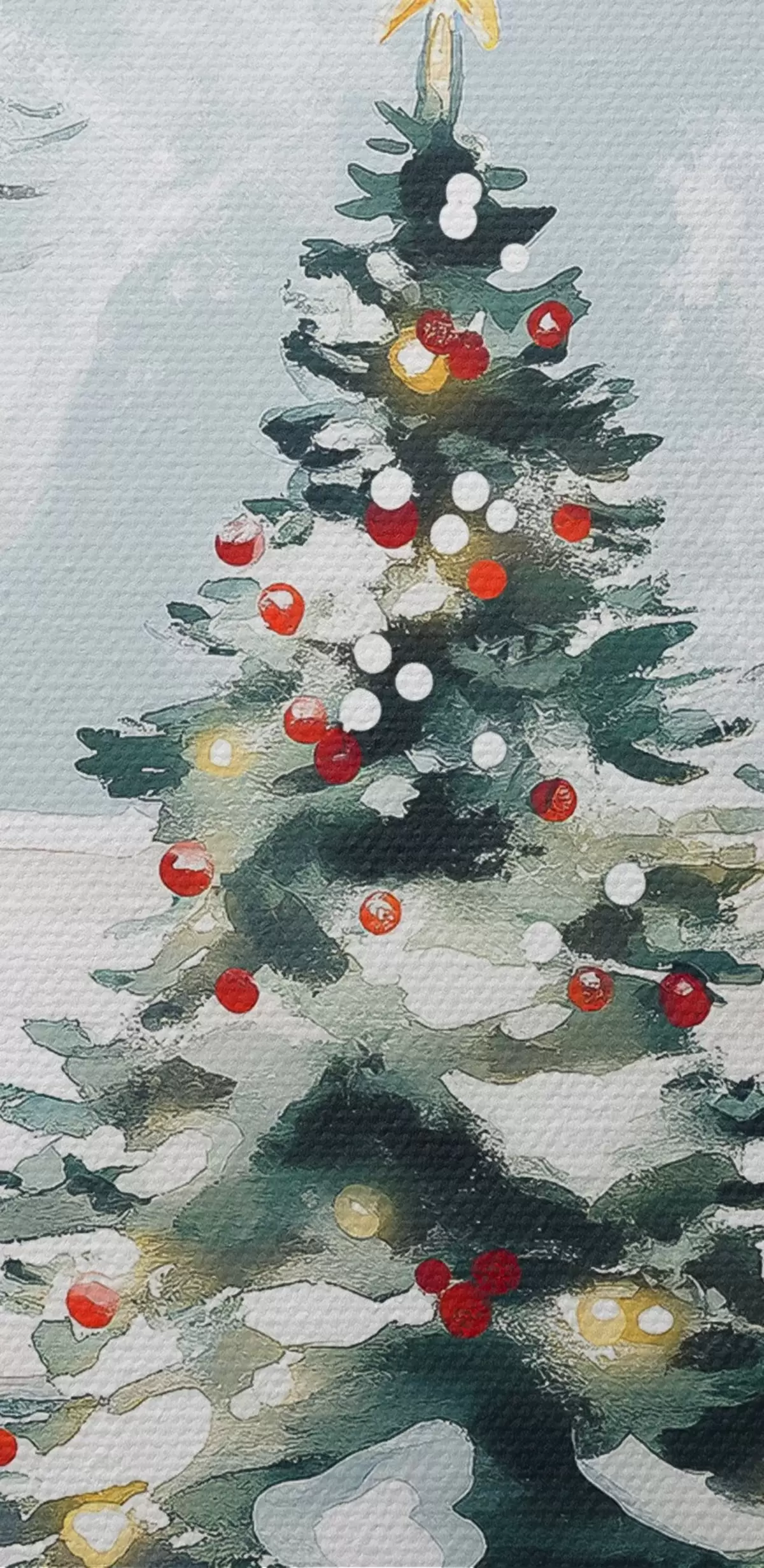 Schilderij Winterstad, versierde dennenboom, kerstmis, aquarel Art. s41364