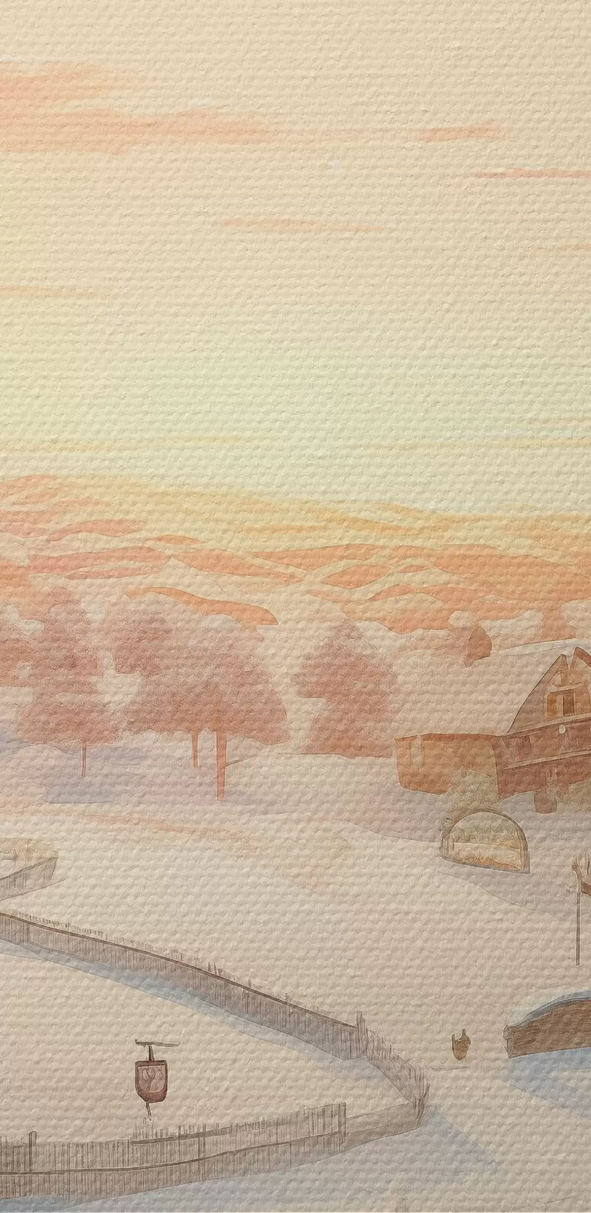 Schilderij Winterdorp in de zonsondergang, huizen bedekt met sneeuw, dennenbomen Art. s41380