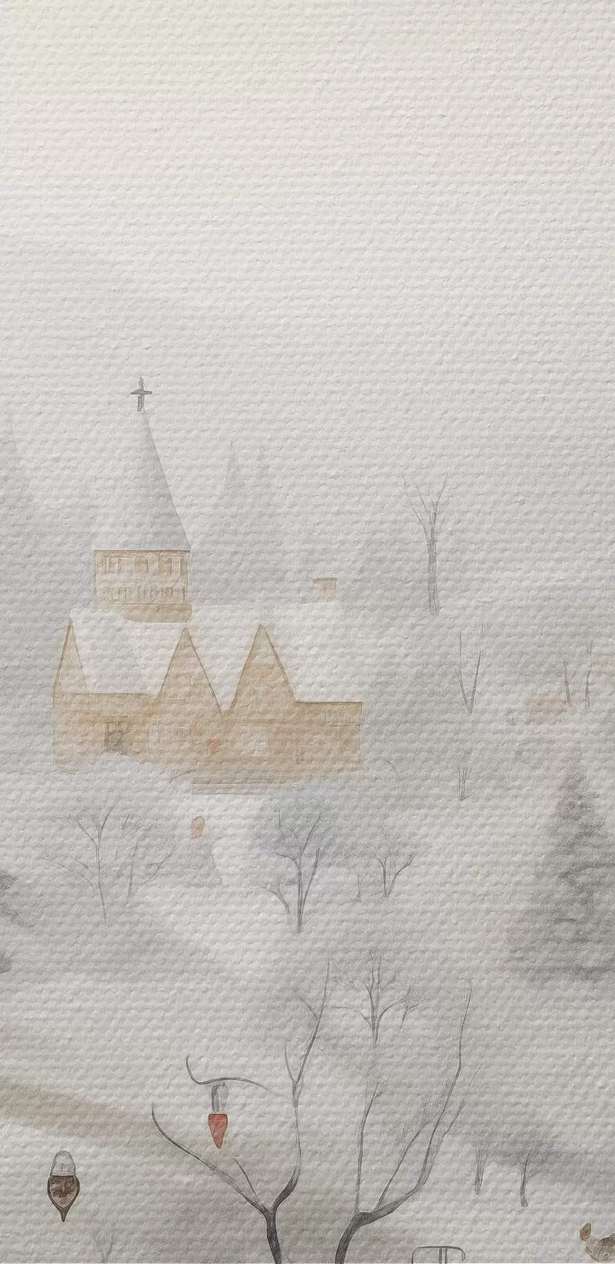 Schilderij Prachtig winterlandschap met dorp, pijnbomen, huizen, bergen Art. s41384