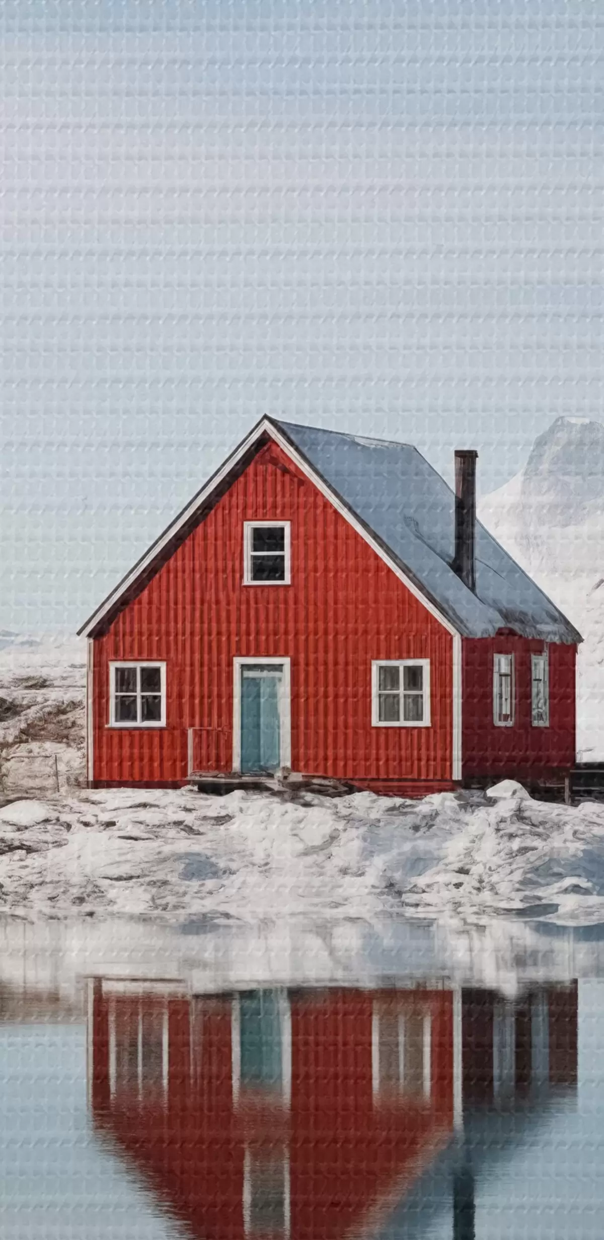 Schilderijen Minimalistisch winterlandschap rood huis aan het meer s41437