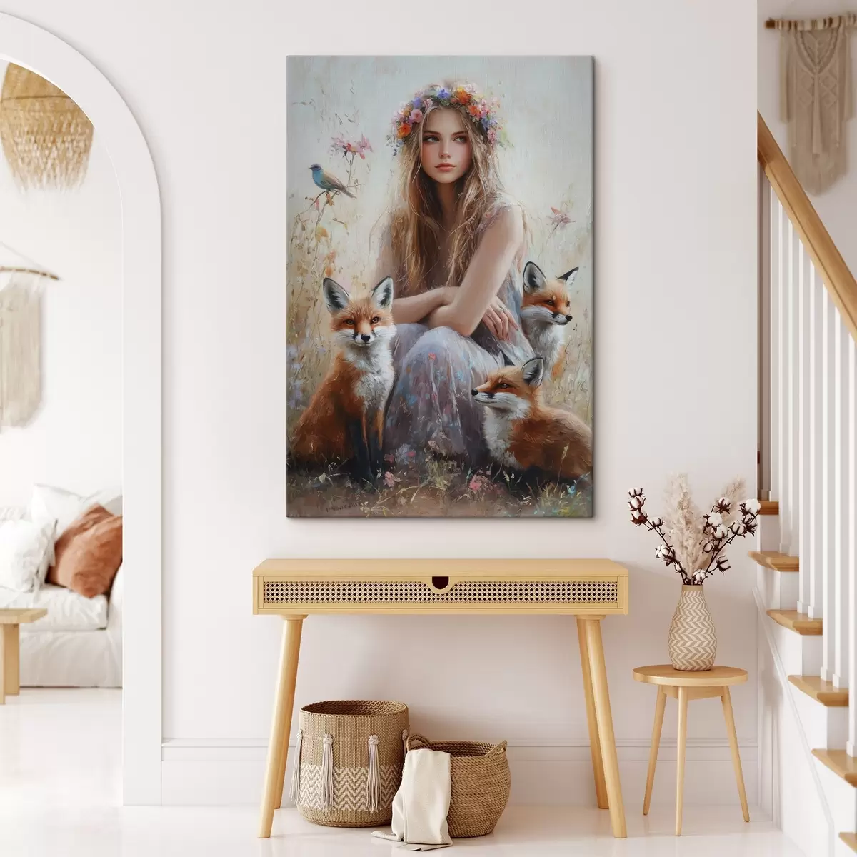 Schilderijen Meisje in de wei, wilde dieren, vossen, vogels, bloemenkrans  s41451