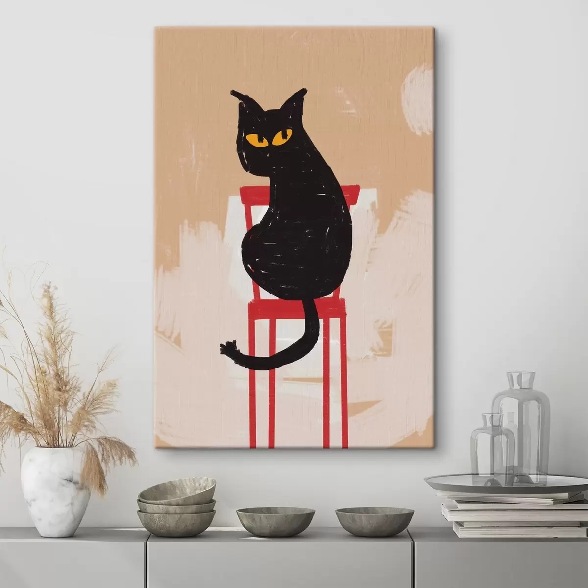 Schilderijen Zwarte kat zittend op rode stoel op beige achtergrond, grove streken, imitatie van schilderij s41612