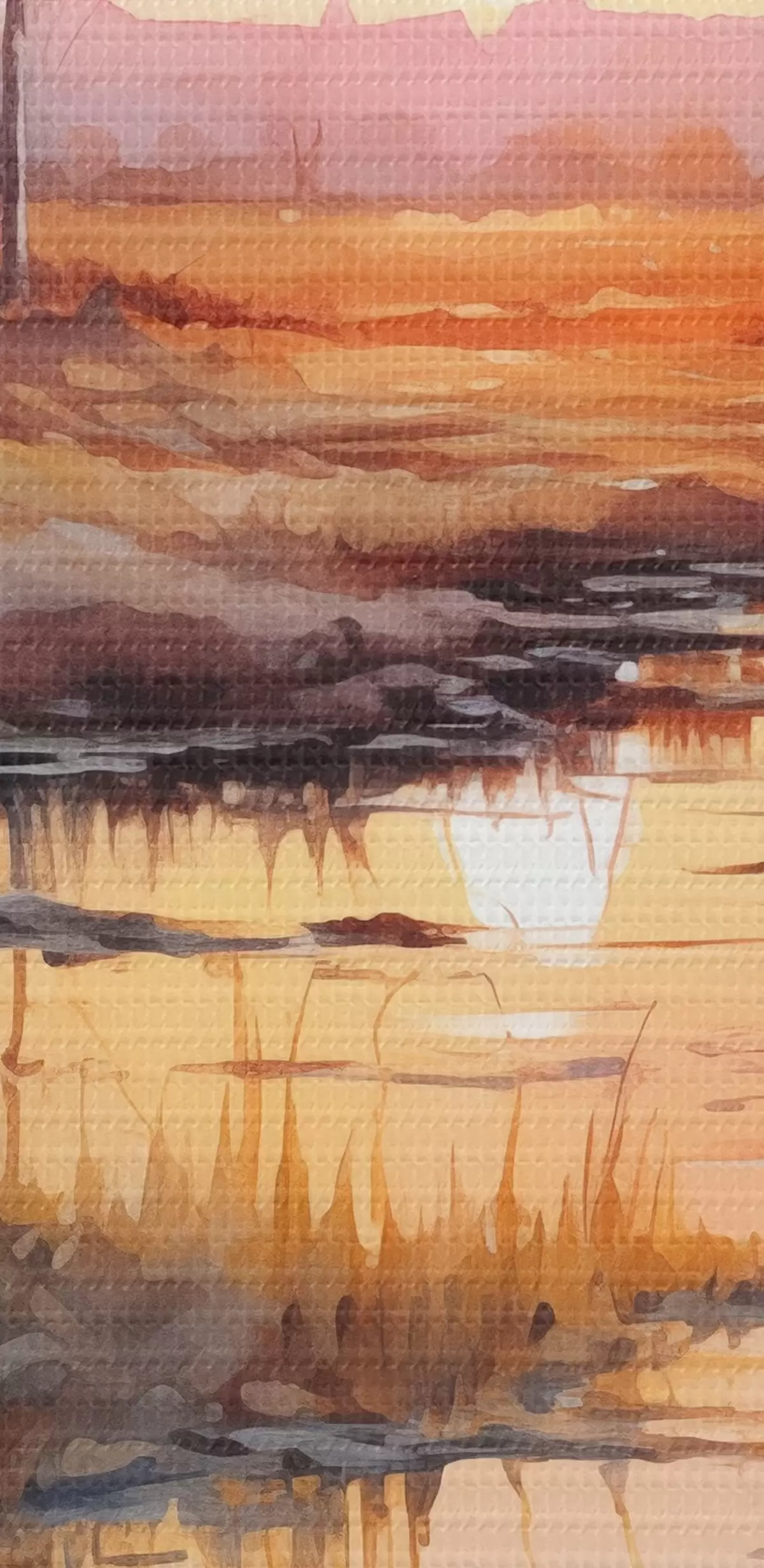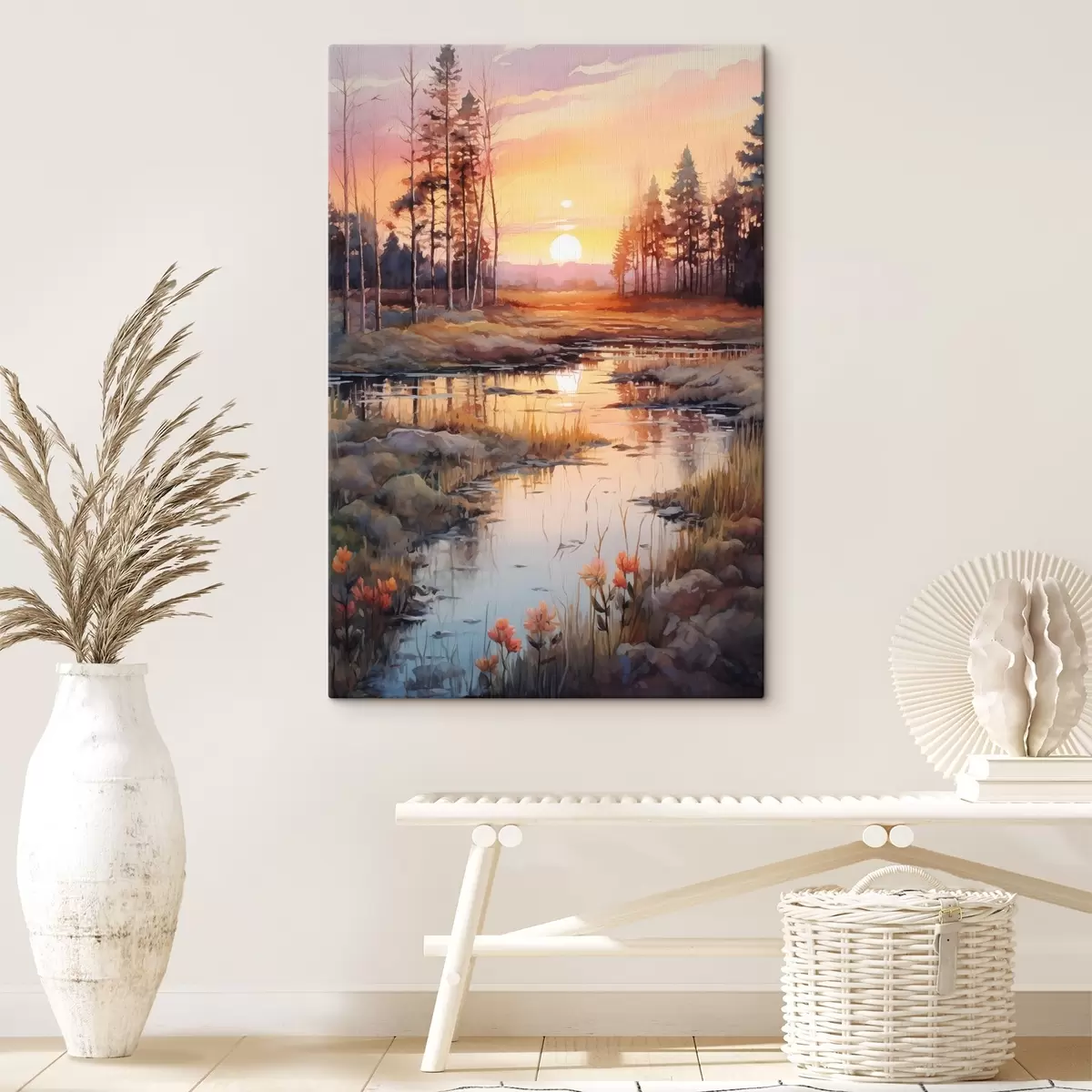 Schilderij Mooie rivier in het herfstbos, aquarel, weide, zonsondergang lucht Art. s41643