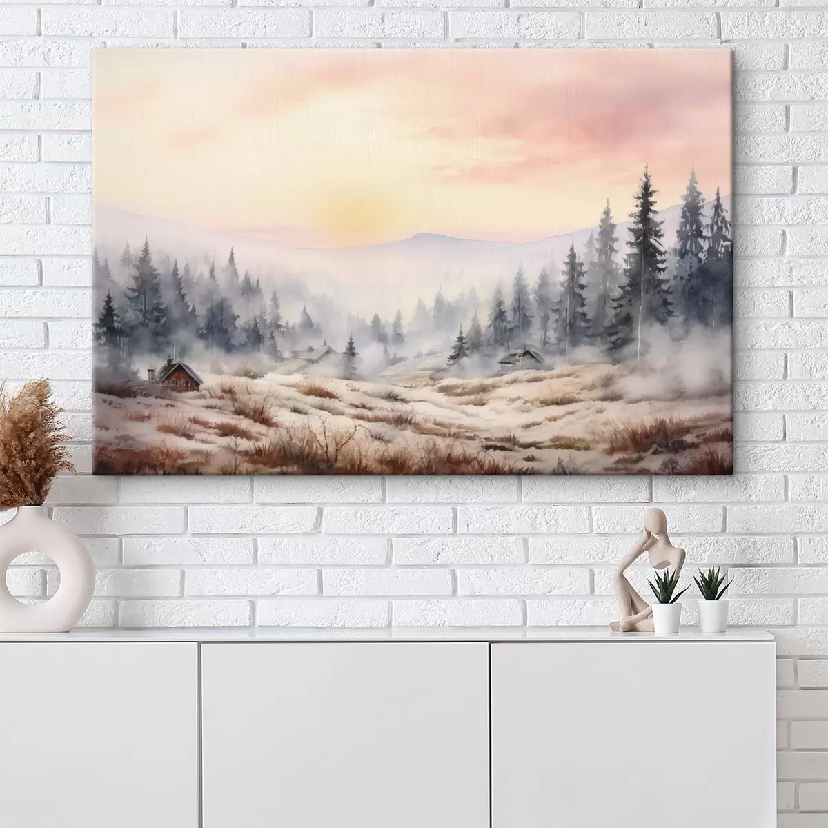 Schilderij Karpaten, bevroren bos, dorp, houten huizen, zonsopgang Art. s41647