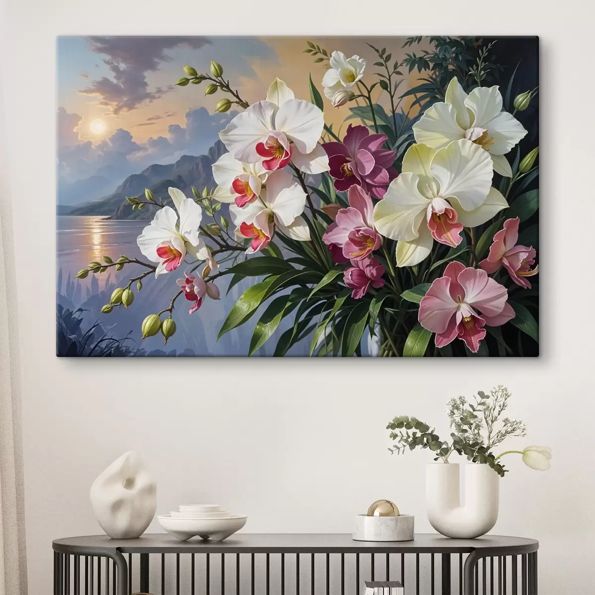 Schilderij Een levendig boeket tropische bloemen met orchideeën en weelderig groen gebladerte tegen een achtergrond van een zeelandschap Art. s41713