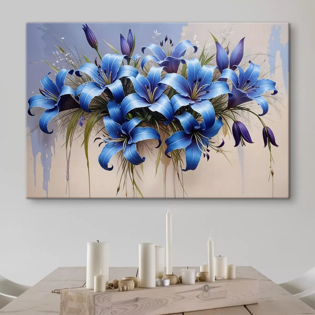 Schilderij Een boeket van levendige blauwe en paarse bloemen met delicate bloemblaadjes en groene bladeren tegen een lichte achtergrond Art. s41714