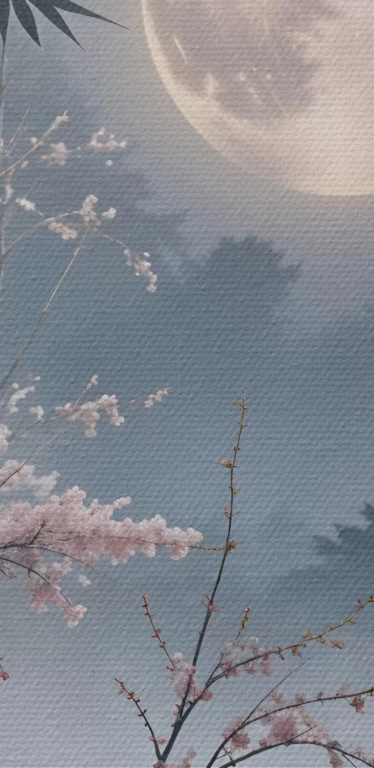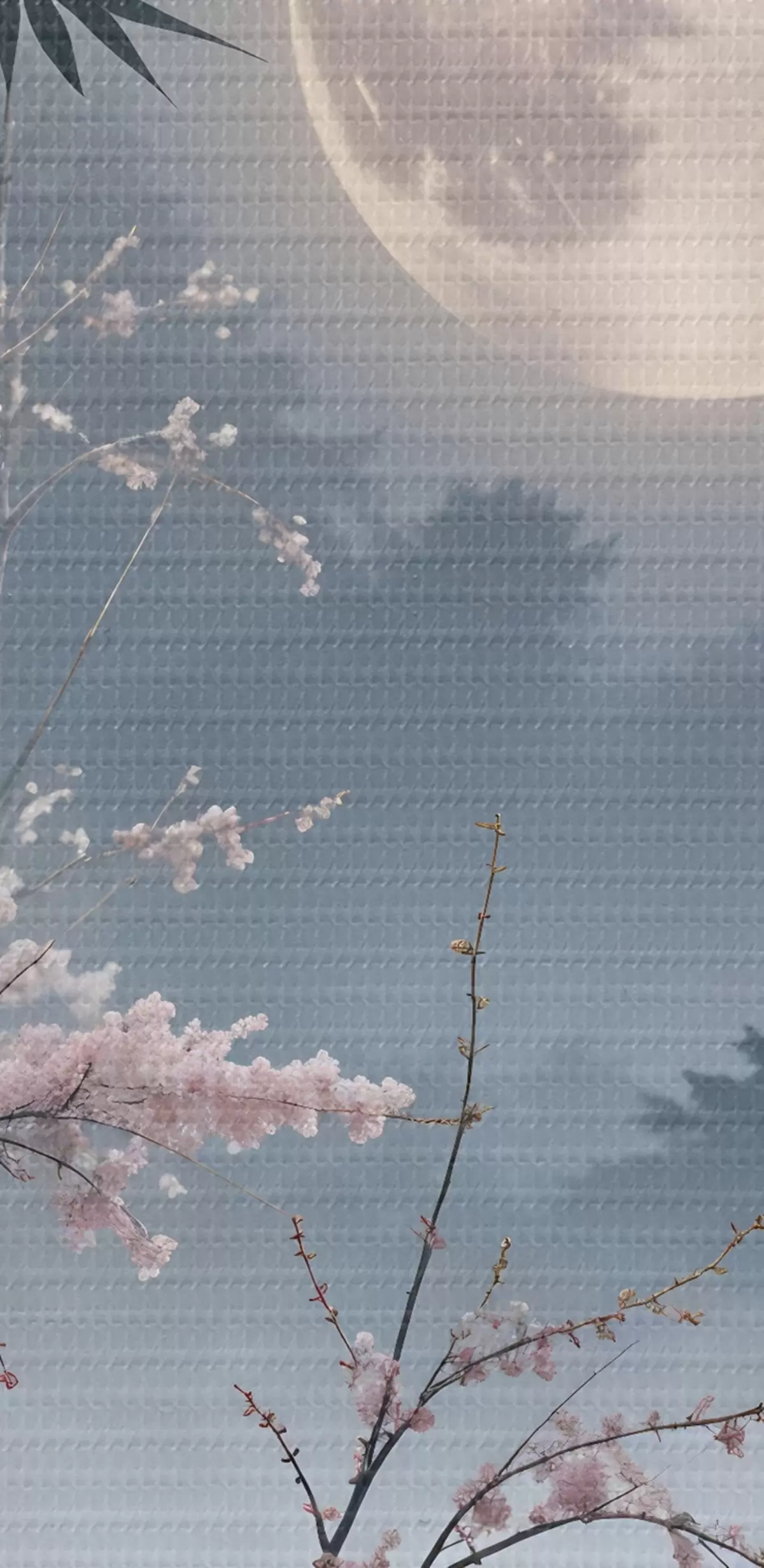 Schilderij Een volle maan aan een nachtelijke hemel, omringd door silhouetten van bamboebomen en kersenbloesemtakken Art. s41717