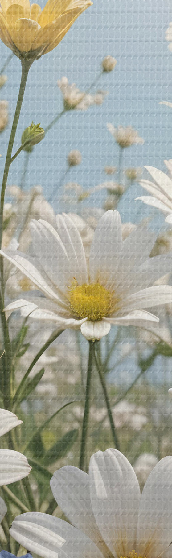Schilderij Een veld van witte en gele margrieten tegen een blauwe lucht met pluizige witte wolken en vlinders die erboven vliegen Art. s41726